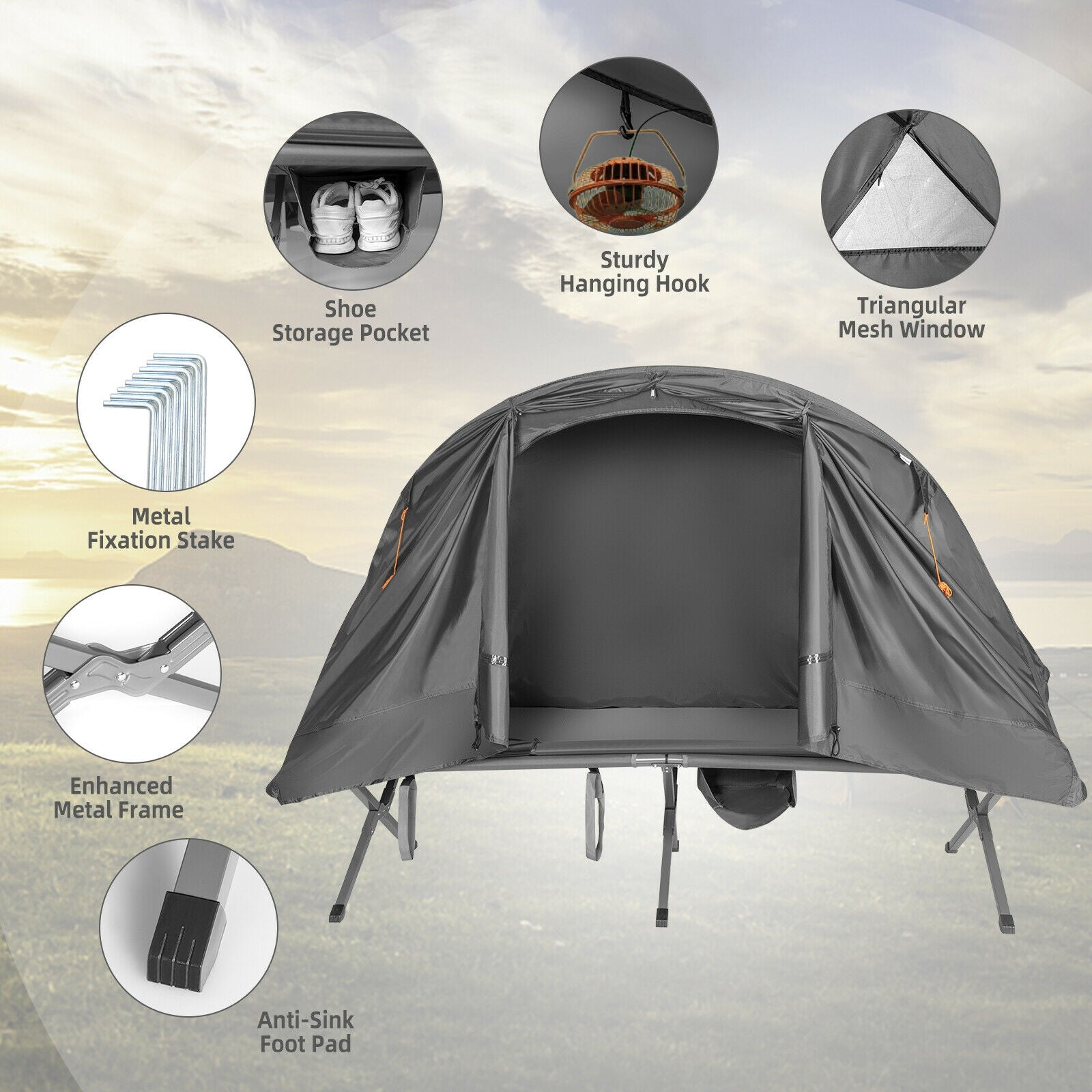 - 4-in-1 camping set includes cot, tent, mattress, and cover