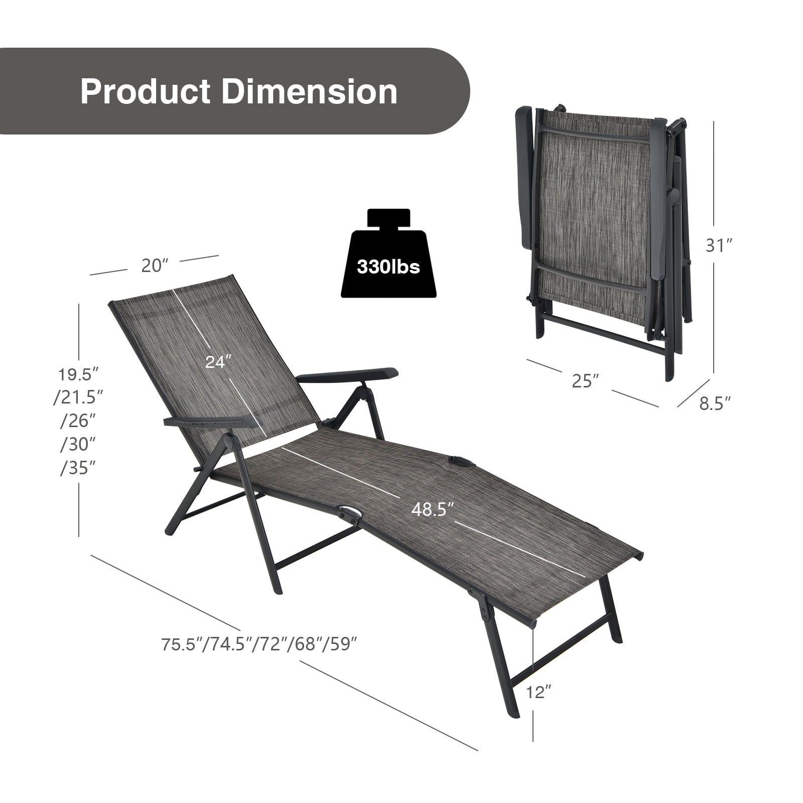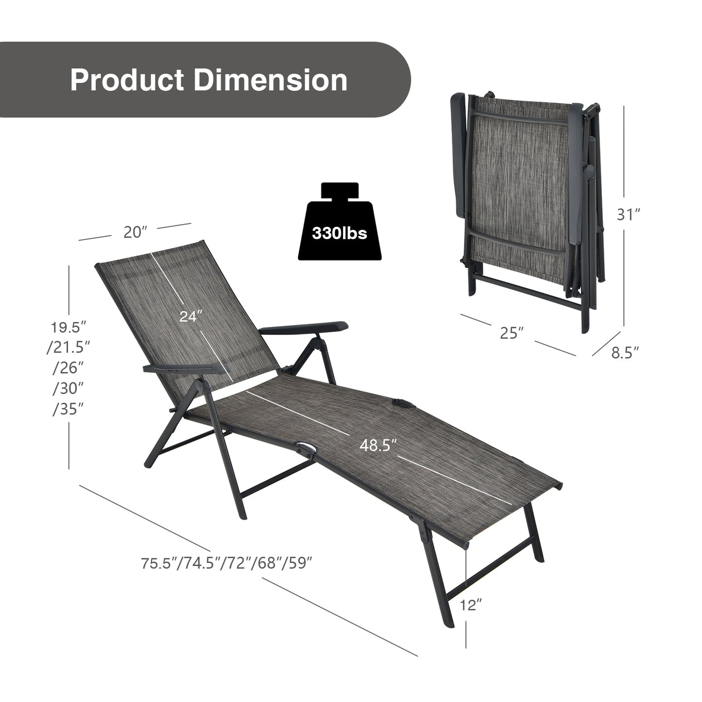 There are 5 different backrest positions and 2 footrest positions that can be adjusted to meet your various needs, such as napping, reading, sunbathing, etc. The chair's main body is made of breathable fabric and its frame is made of reinforced steel, which makes it sturdy and comfortable to sit on. The non-skid footpads on the bottom give considerate protection to the ground. The chair doesn't need to be assembled, you just unfold it and it's ready to use. When folded, it measures only 25" x 8.5" x 31" (L x W x H), which is simple to carry and store. You can take this adjustable chaise lounge chair anywhere you want to go, such as yard, poolside, beach and so on. It will definitely bring ease and comfort to your journey!