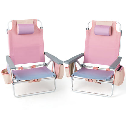 Experience ultimate outdoor relaxation with these premium folding beach chairs featuring a 5-position adjustable backrest for reading, sunbathing, or chatting. Waterproof PVC material and padded head pillows ensure maximum comfort and breathability, while the sturdy anti-rust aluminum frame supports up to 300 lbs per chair.