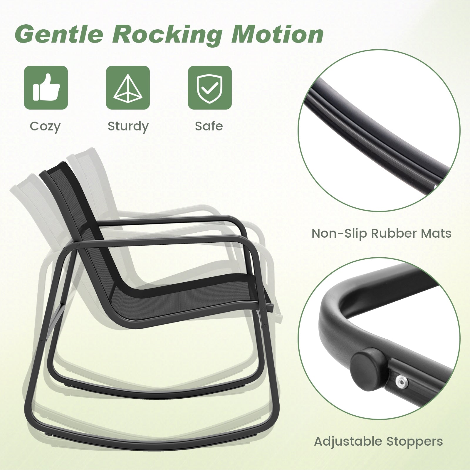 - Sturdy and safe 3-piece patio rocking set.