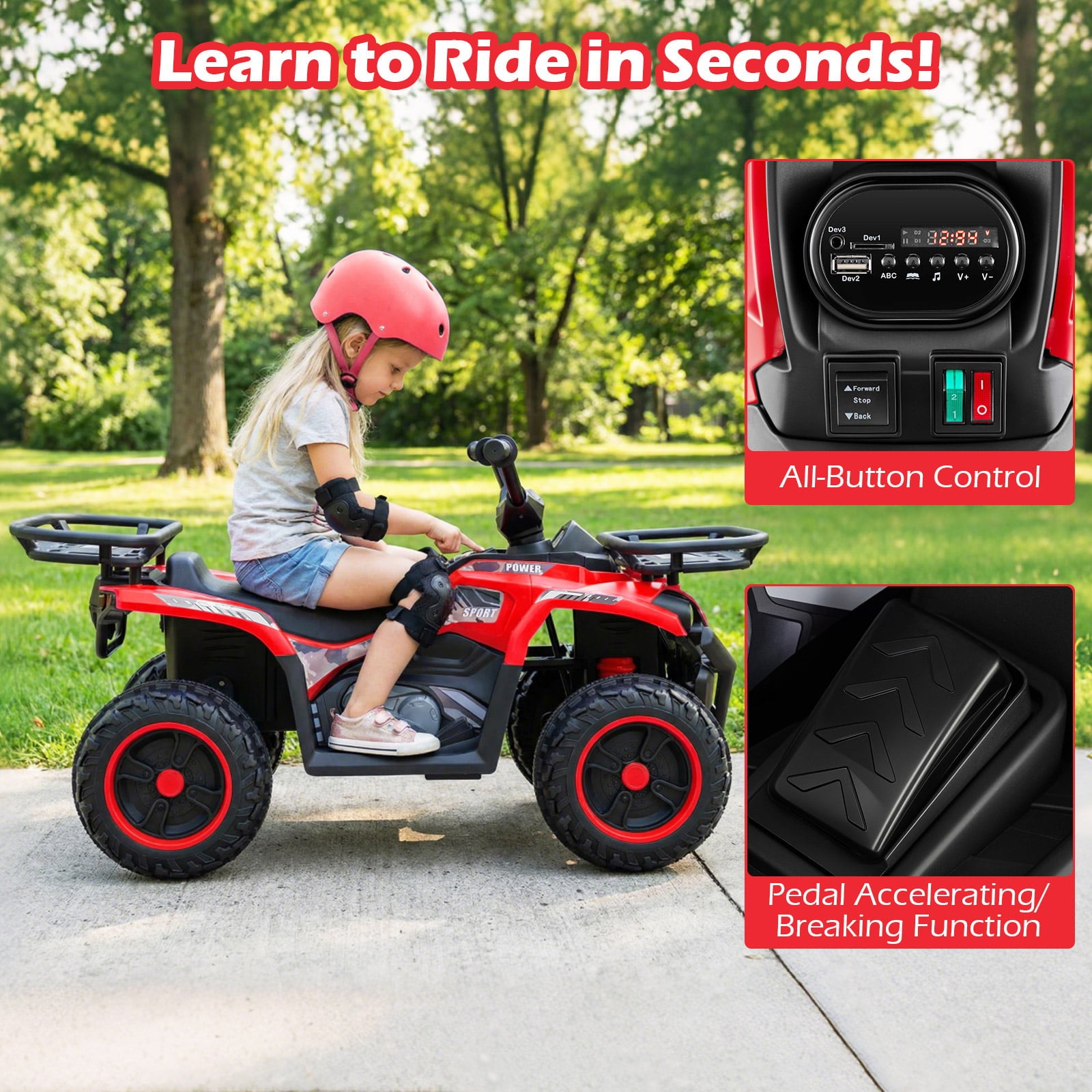 Easy-grip handles, comfortable seat and foot pedal for a realistic ATV ride