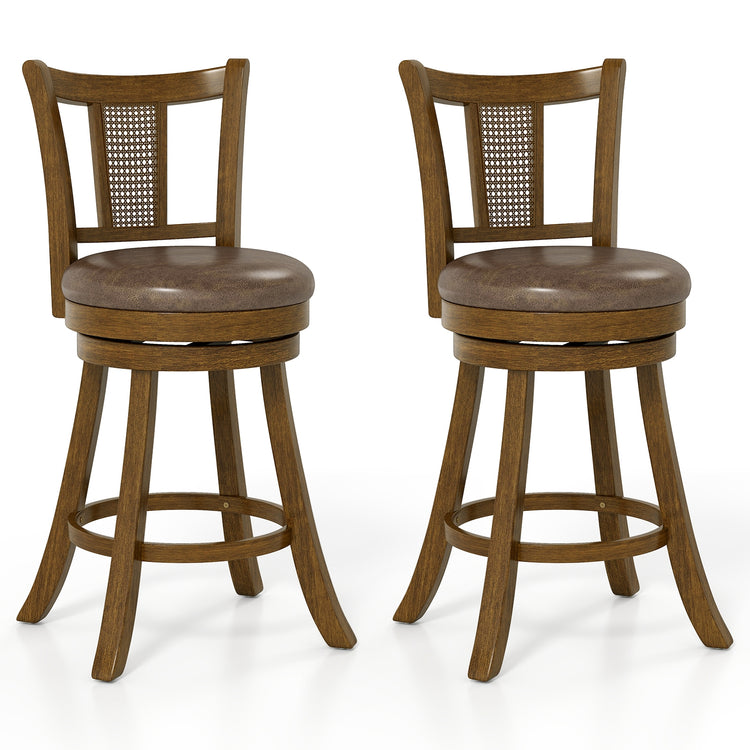 25 Inch Set of 2 Bar Stools with PE Rattan Backrest and Rubber Wood Frame, Brown