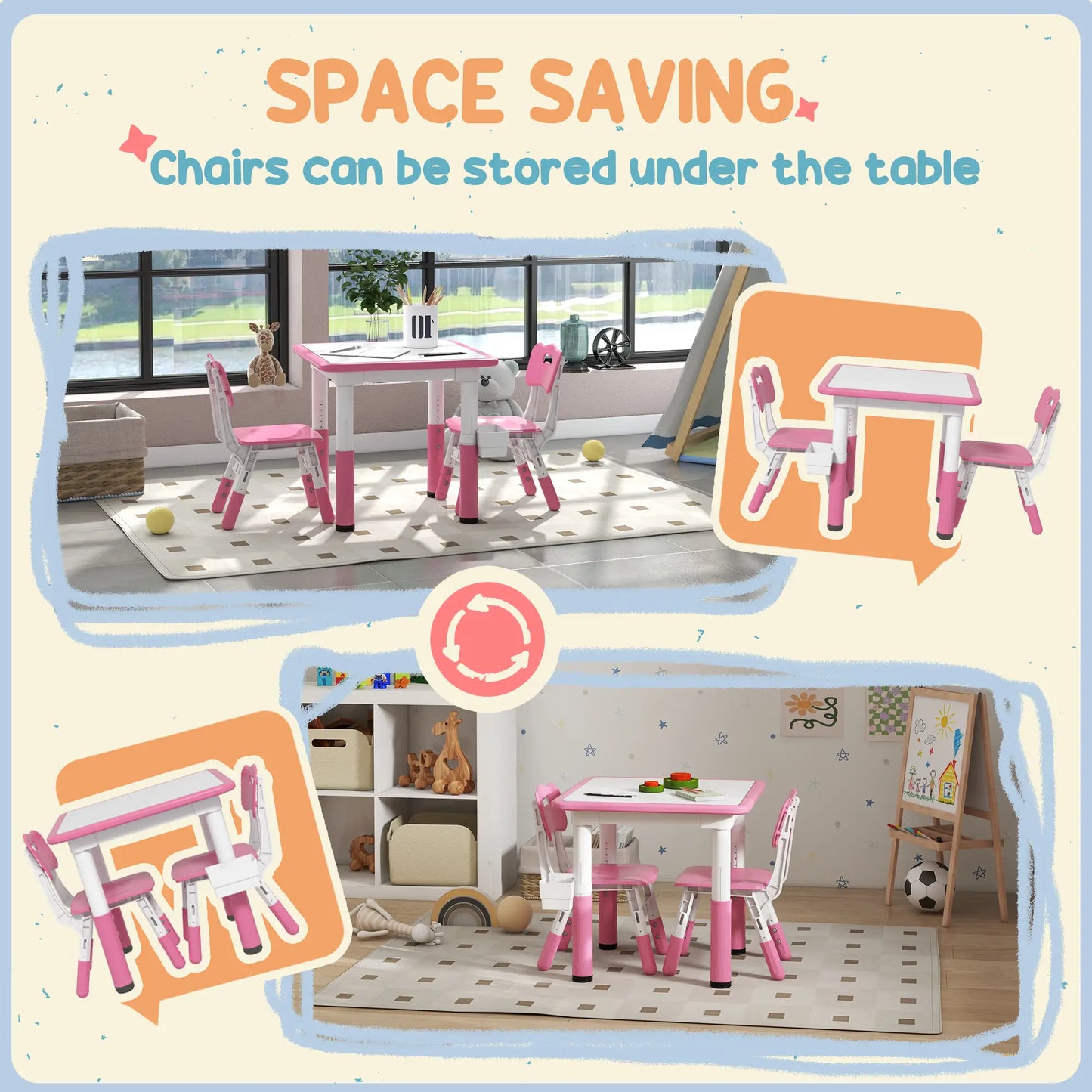 Discover the perfect kids table and chairs set designed for fun, creativity, and learning. This adjustable height set includes a table and four chairs, ideal for playdates, homework, and meals. Easy-to-clean surfaces and a handy storage box make it a practical choice for parents.