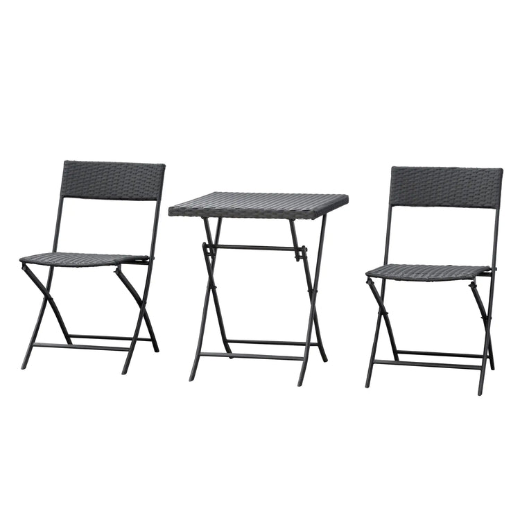 Enhance your outdoor living space with this elegant 3-piece rattan bistro coffee set, perfect for gardens, patios, or balconies. Crafted from durable metal tubing and covered with weather-resistant PE rattan, this set includes 1 table and 2 chairs, offering both style and functionality. Its foldable design ensures easy storage and space-saving convenience.