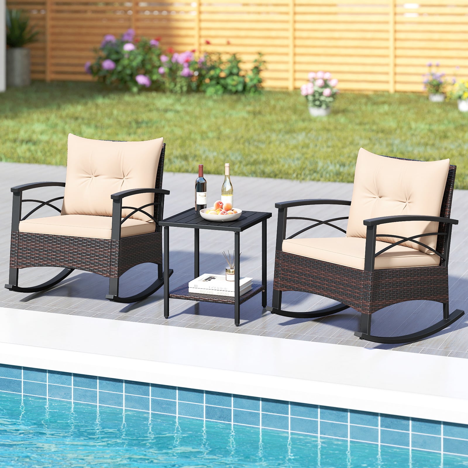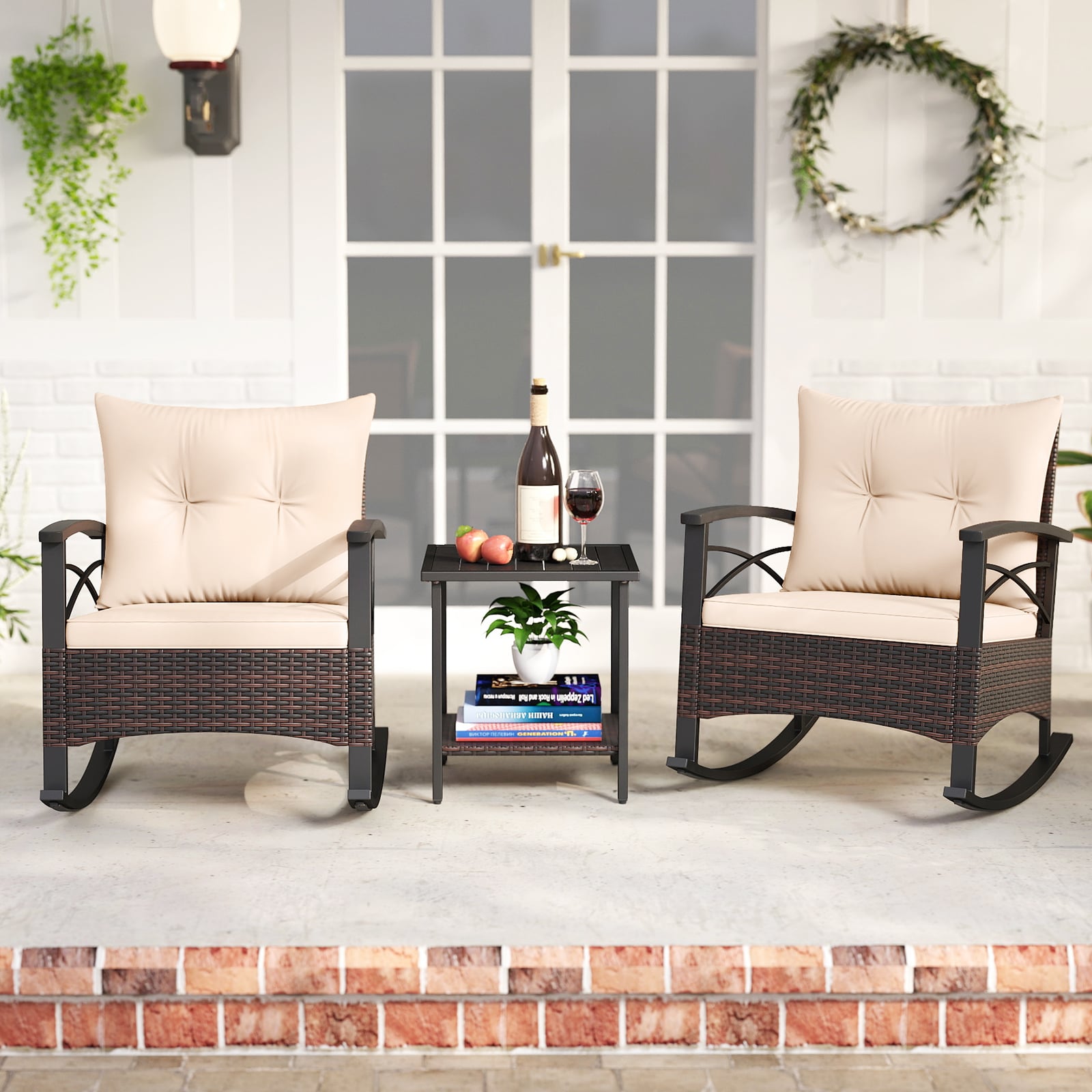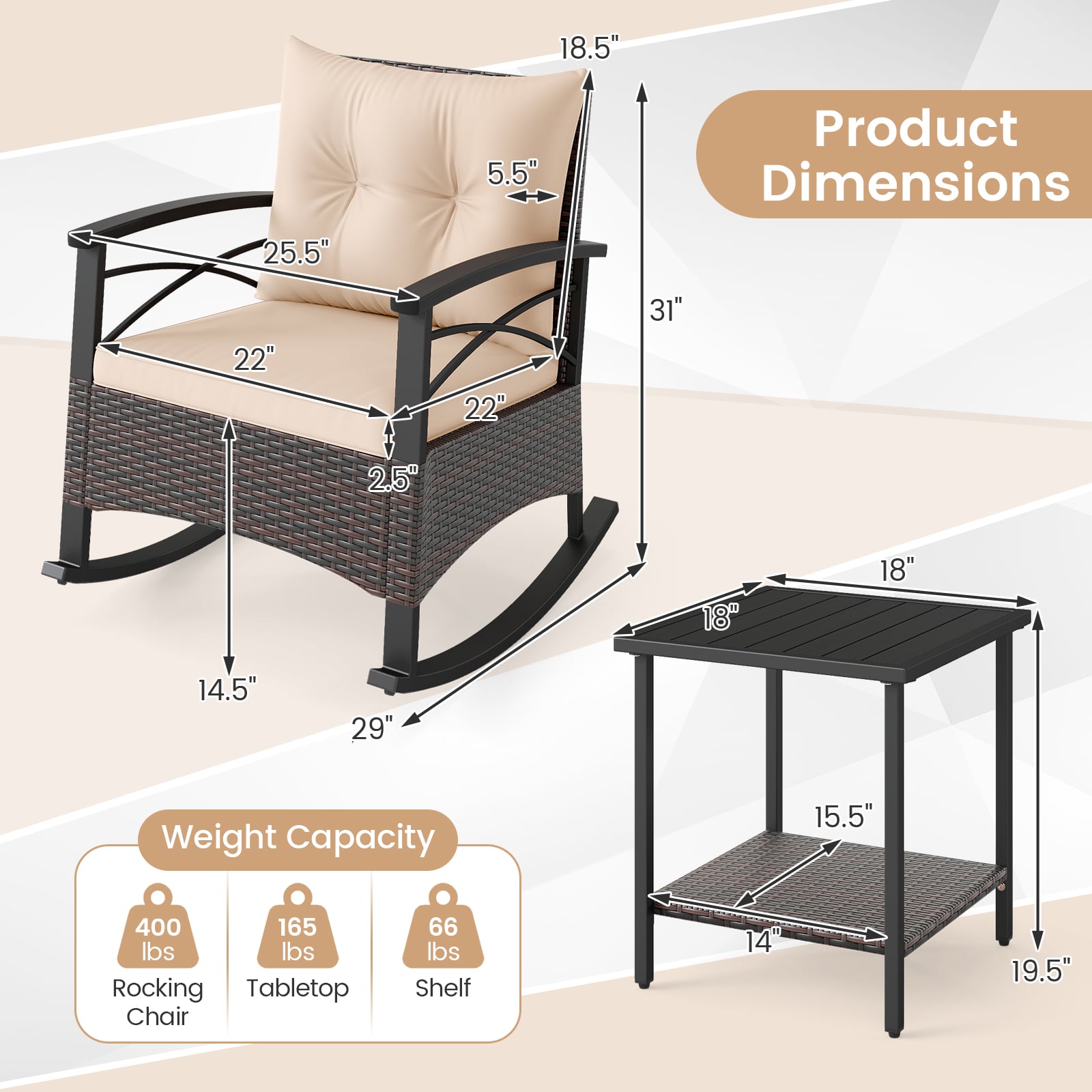 • Package Includes: 2 x Patio Rocking Chairs, 1 x Side Table, 2 x Seat Cushions