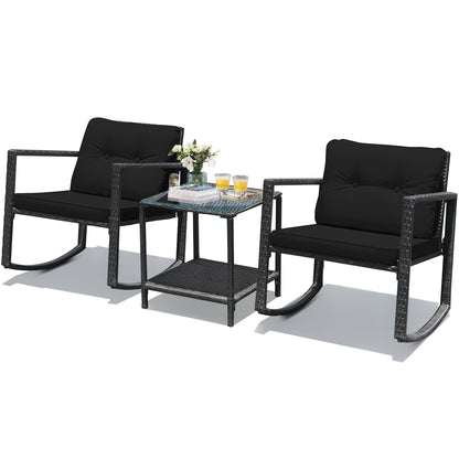 3 Pieces Cushioned Patio Rattan Set with Rocking Chair and Table, Black