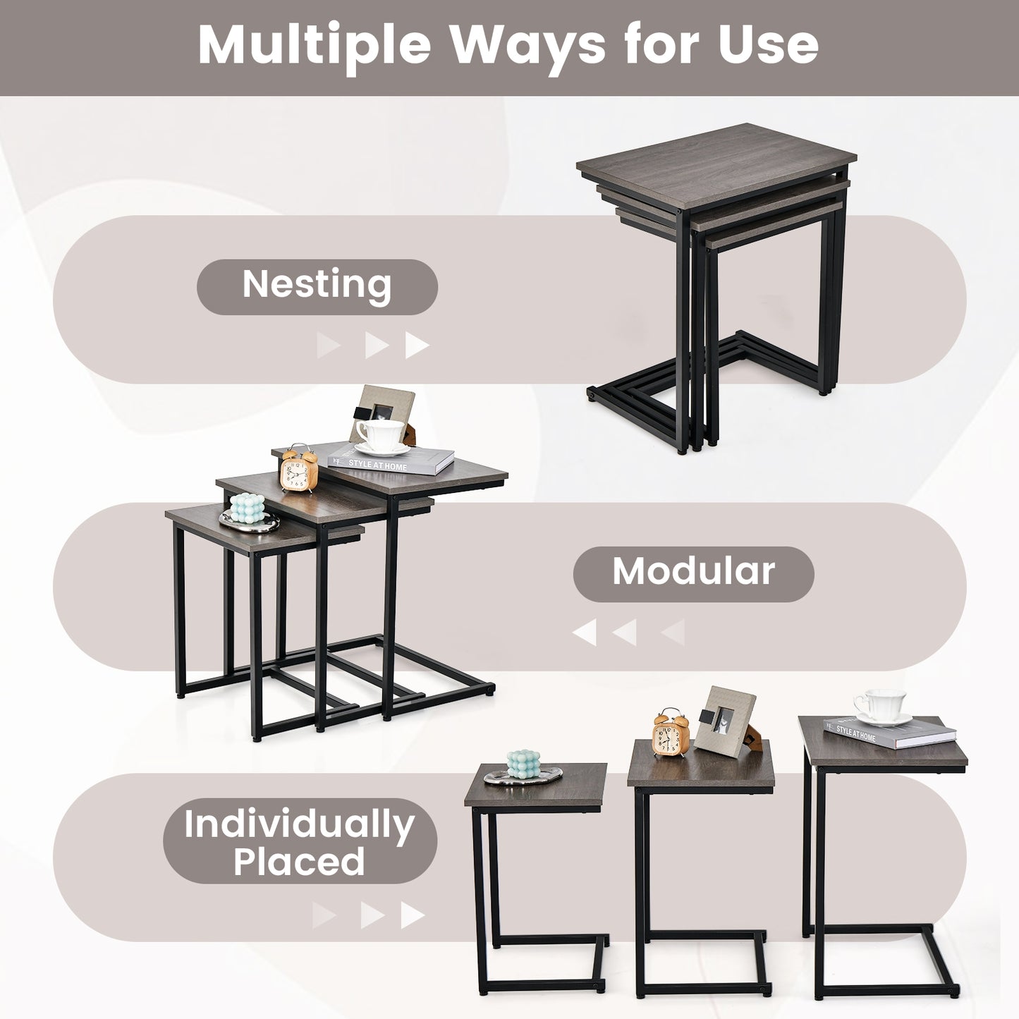 - Appeal: A set of three C-shaped side tables designed for convenience and space-saving.