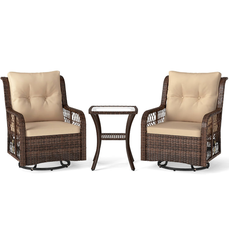 3 Pieces Patio Furniture Set PE Wicker Swivel Glider Chairs with 2-Tier Side Table and Cushions, Brown