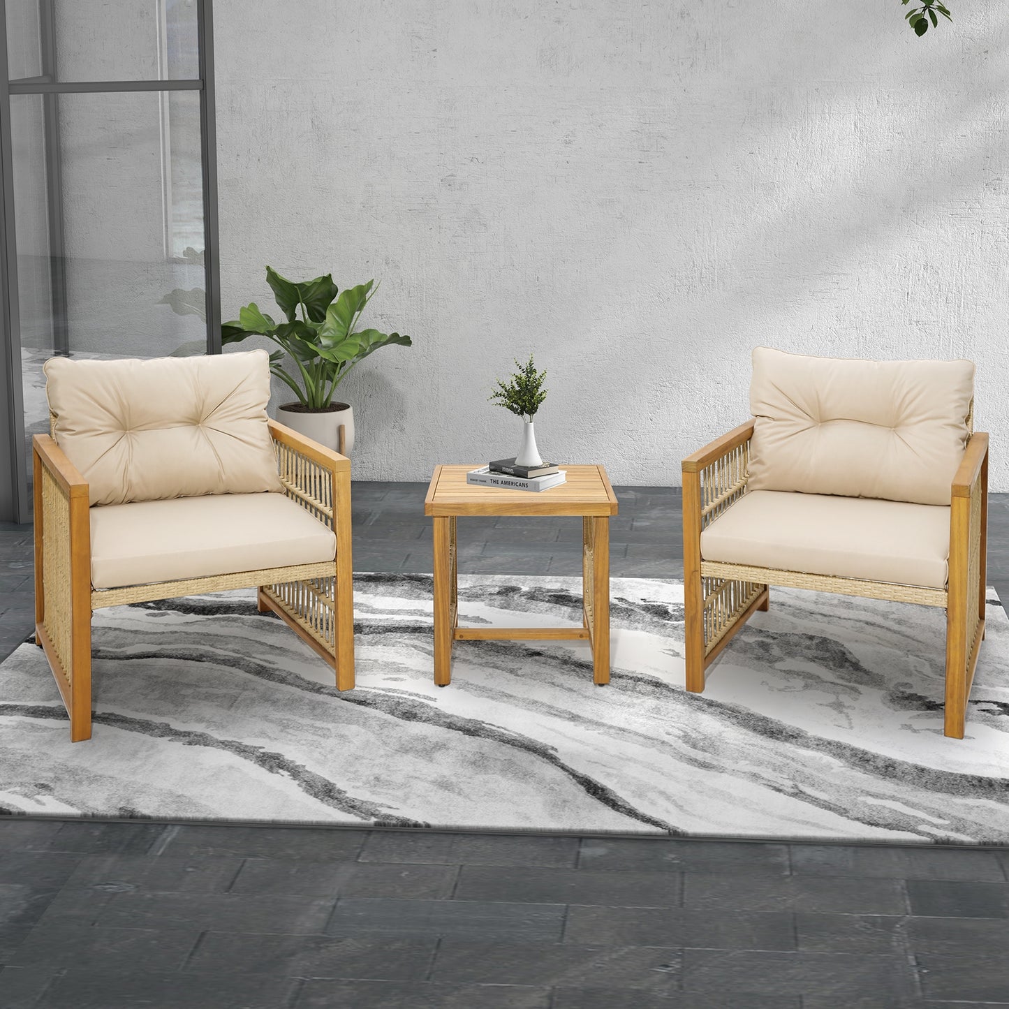3 Pieces Patio PE Wicker Conversation Set with Acacia Wood Frame and Cushions, Beige