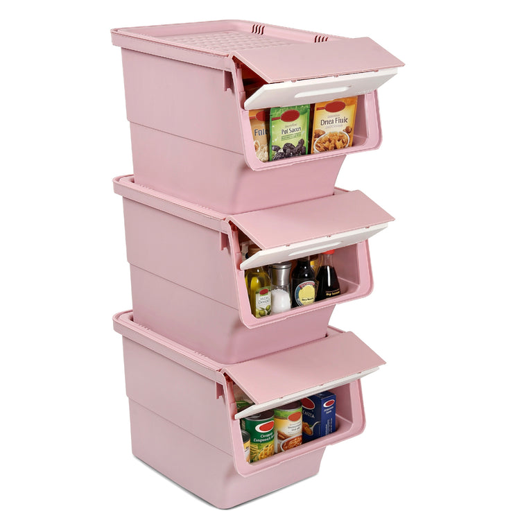 3 Pieces Storage Bins on Wheels Stackable Plastic Boxes with Stay-Open Lid (M), Pink