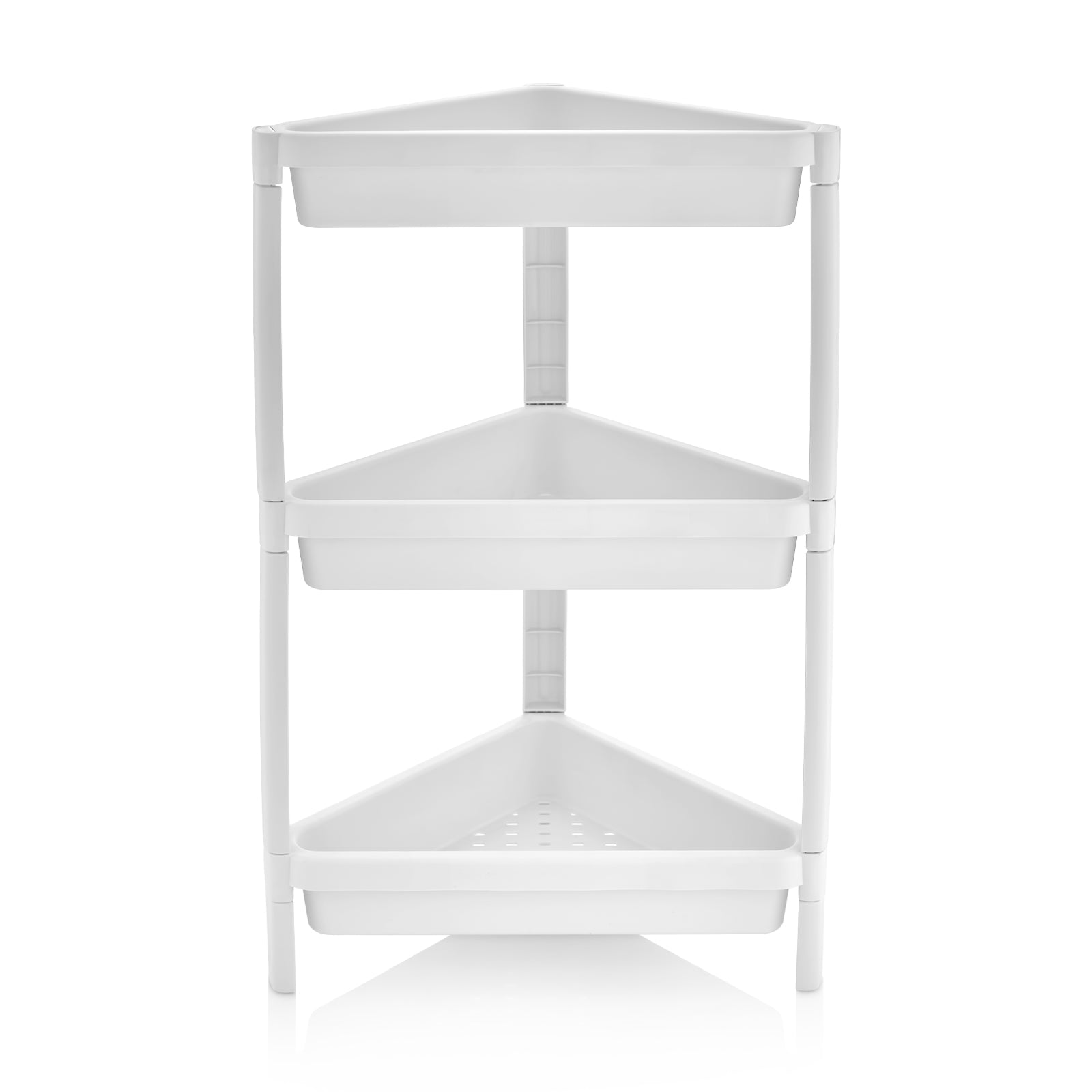 Space-saving Corner Design: These corner shower caddies feature thoughtful triangular shapes that fit perfectly into corners, greatly saving valuable space in your bathroom, kitchen, living room and bedroom.Ample 3-Tier Storage: Equipped with 3 spacious shelves and raised baffles, each corner shelf stand securely holds a variety of items while preventing them from falling off.