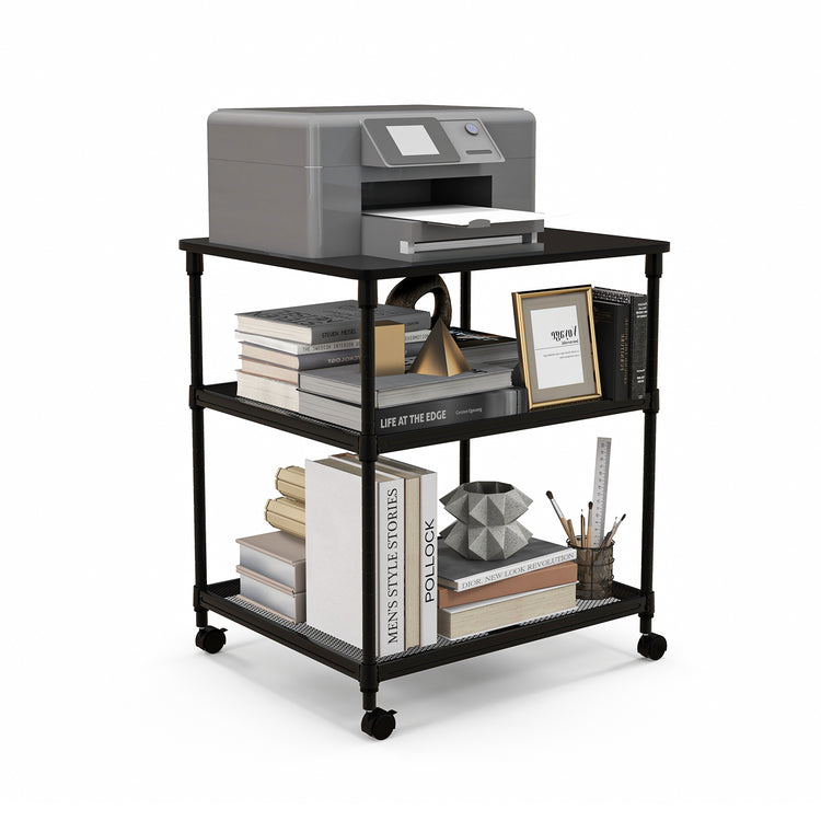 3 Tier Printer Stand Rolling Fax Cart with Adjustable Shelf and Swivel Wheels, Black