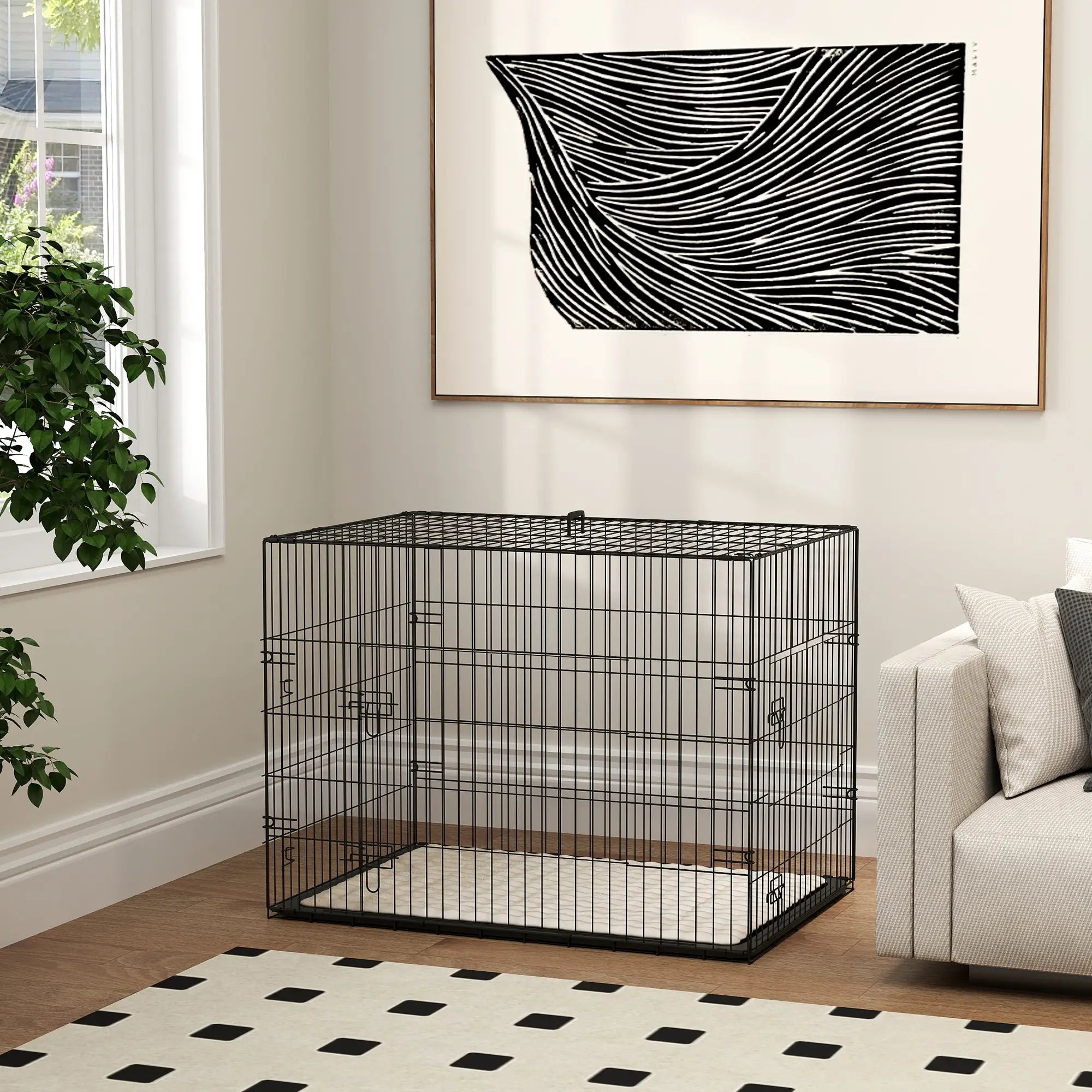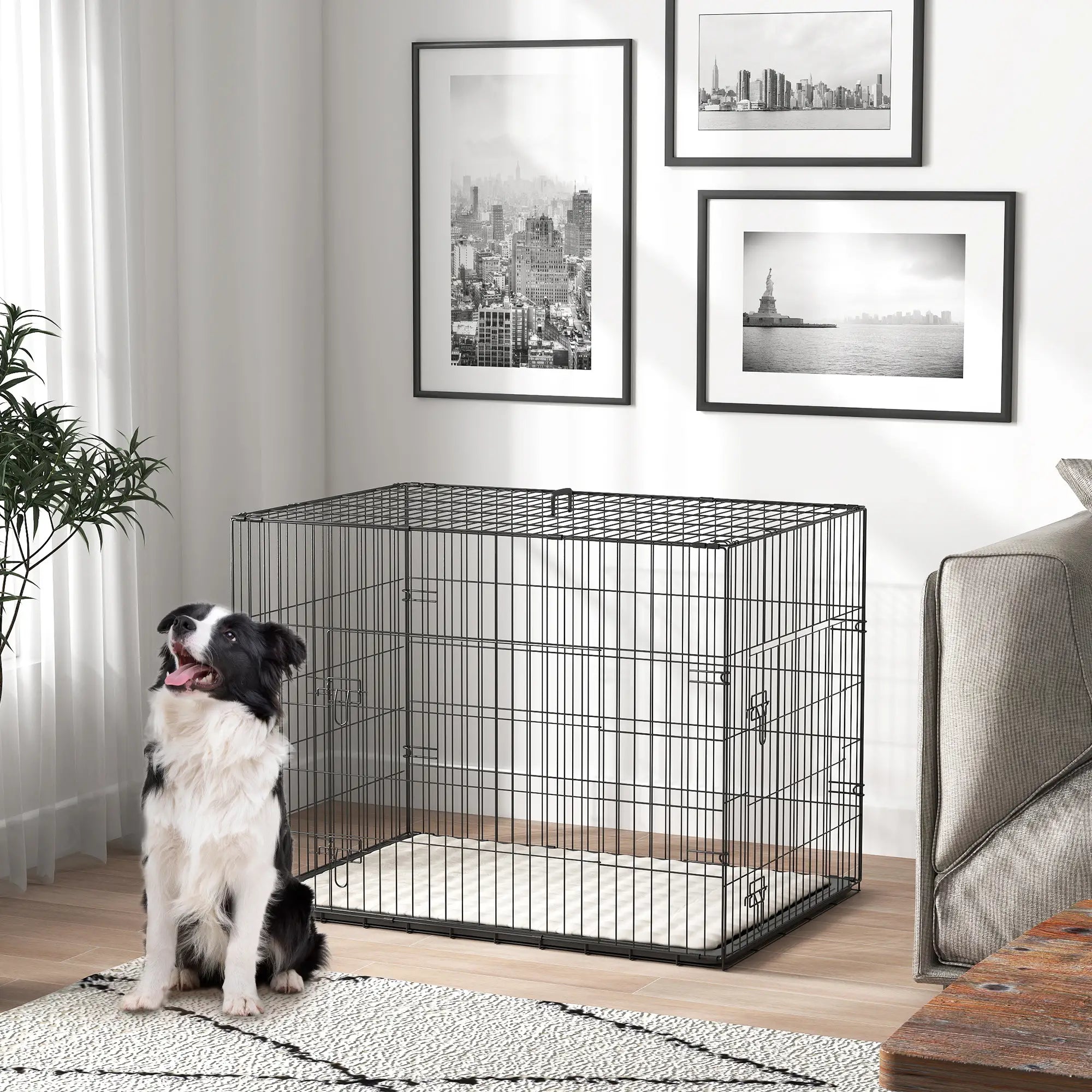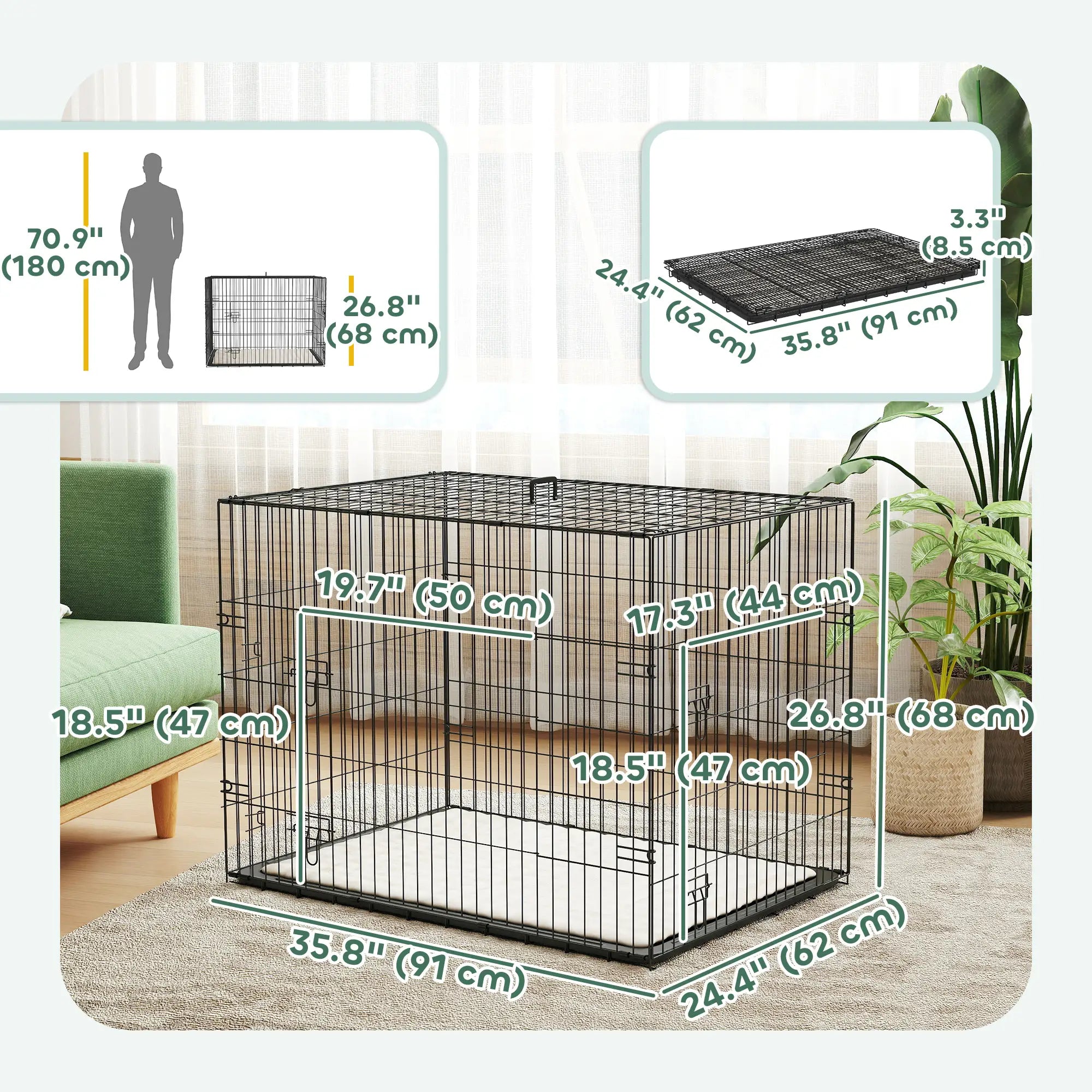 35" Dog Crate, Folding Metal Cage, Removable Tray, Cushion, Black