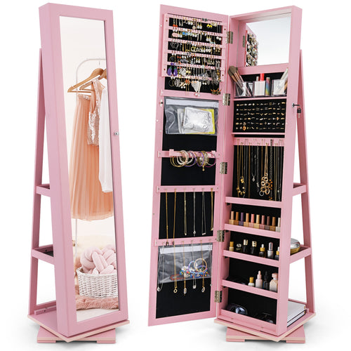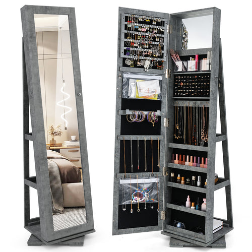 This 2-in-1 freestanding jewelry cabinet combines a full-length mirror with a spacious jewelry organizer, featuring a 360-degree rotating base for easy access and a lockable design for secure storage. Made from durable P2 MDF, it includes velvet-lined compartments, numerous hooks and slots, and additional shelves to keep all your accessories neatly organized and protected.