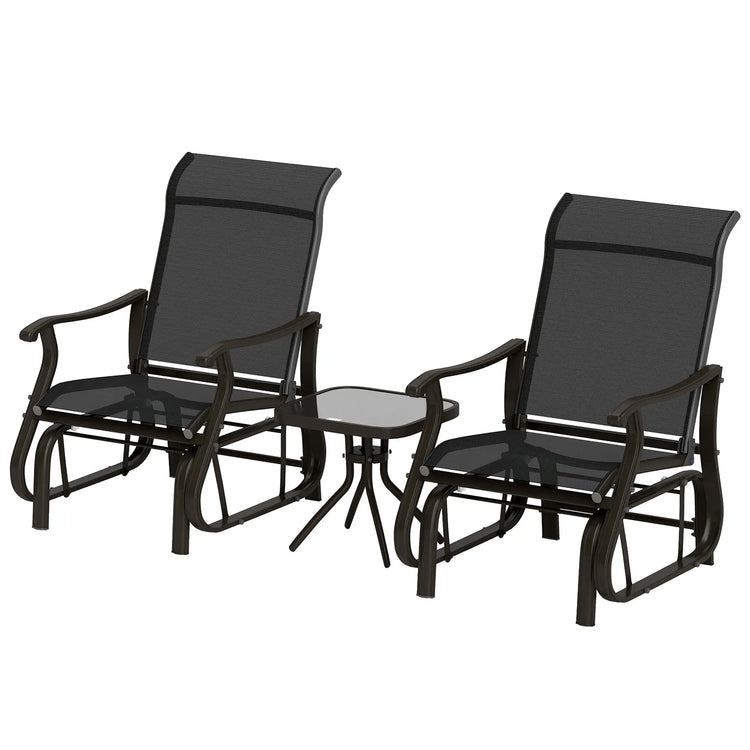 Experience the ultimate relaxation with this stylish outdoor glider set, perfect for enjoying warm summer days. The set includes two comfortable gliding chairs and a matching tea table, designed for durability and comfort with powder-coated steel frames and breathable mesh fabric.