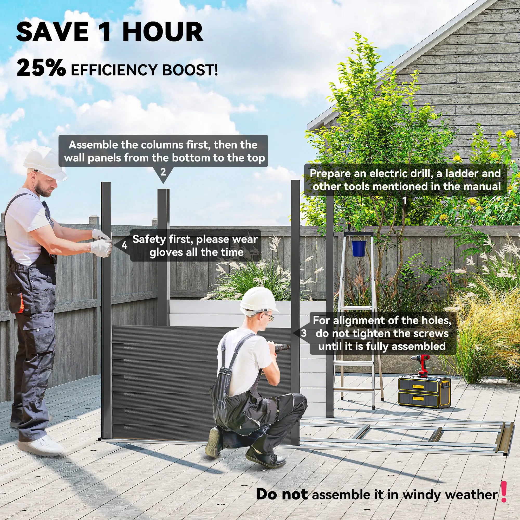 - Special note: Requires at least three people to install it in three hours. Do not install in strong windy conditions. Wear cut-resistant gloves during assembly.