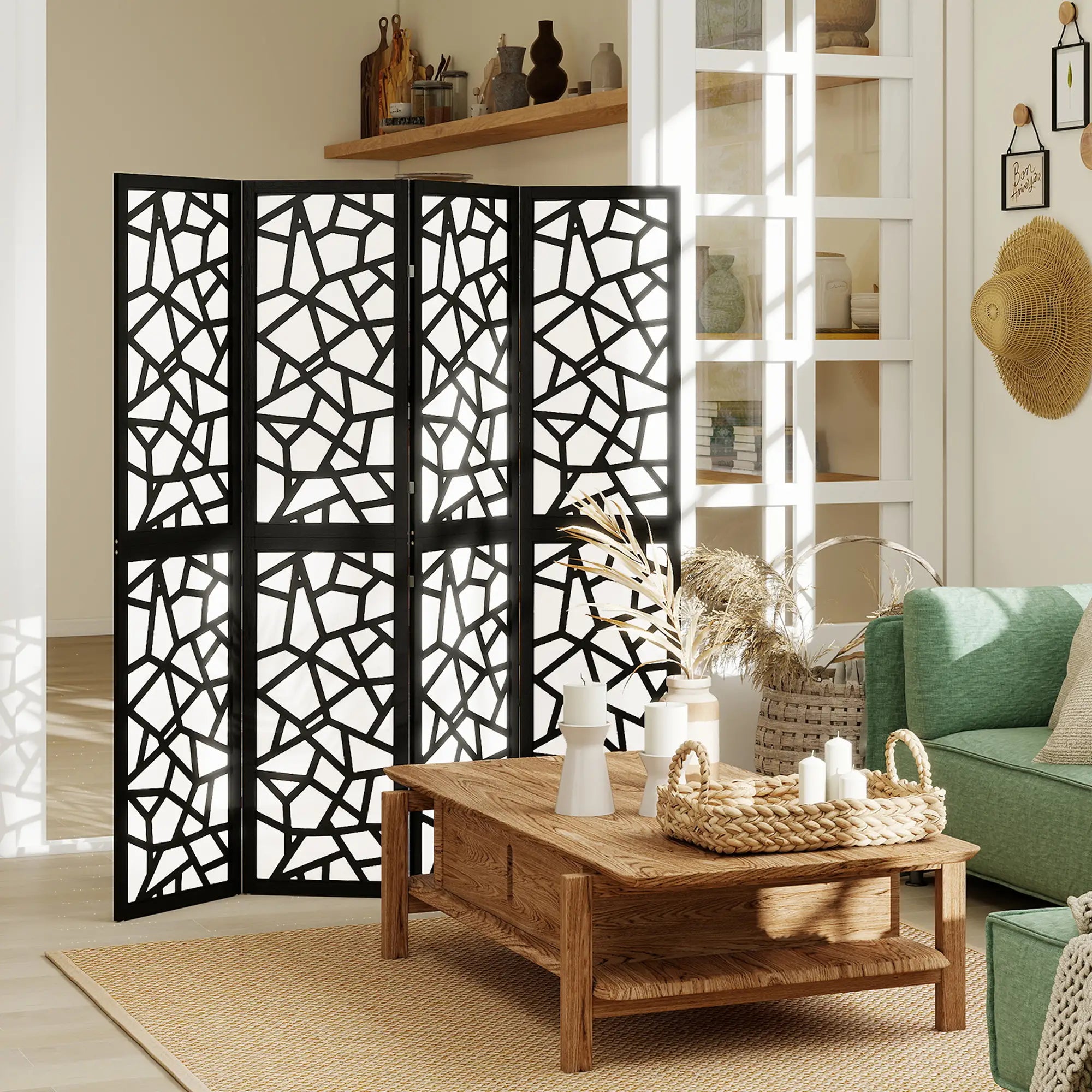 4 Panel Room Divider, 5.6 FT, Geometric Pattern Privacy Screen, Black