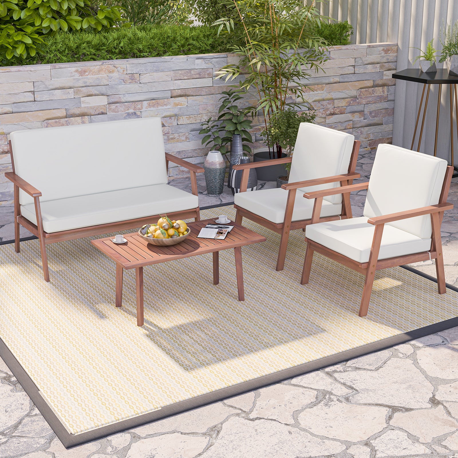 Experience ultimate outdoor relaxation with this 4-piece acacia wood patio furniture set, featuring high-density cushions, durable natural wood frames, and versatile arrangement options for your backyard, poolside, or porch. Perfect for comfortable seating and entertaining.