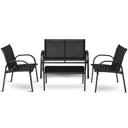 • 4-piece solid patio sofa set equipped with 1 loveseat, 2 chairs, and 1 coffee table.