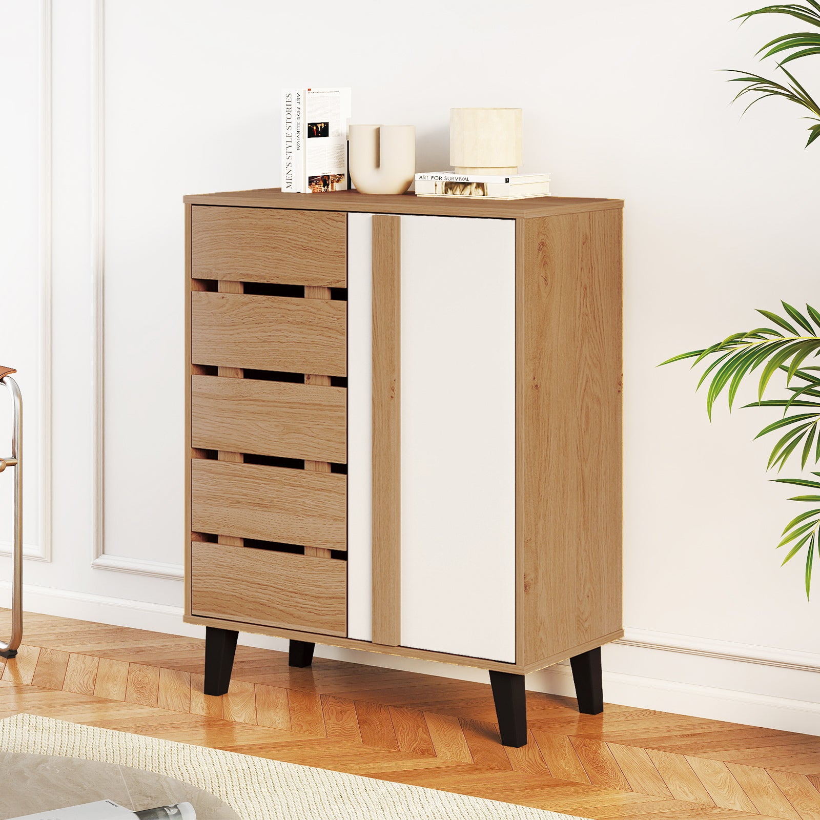 Well-Ventilated Design: Equipped with 2 louvered doors/a left louvered door and 2 vent holes on the back panel, this shoe cabinet ensures proper airflow. The design helps prevent unpleasant smells and keeps your shoes fresh inside the storage rack.