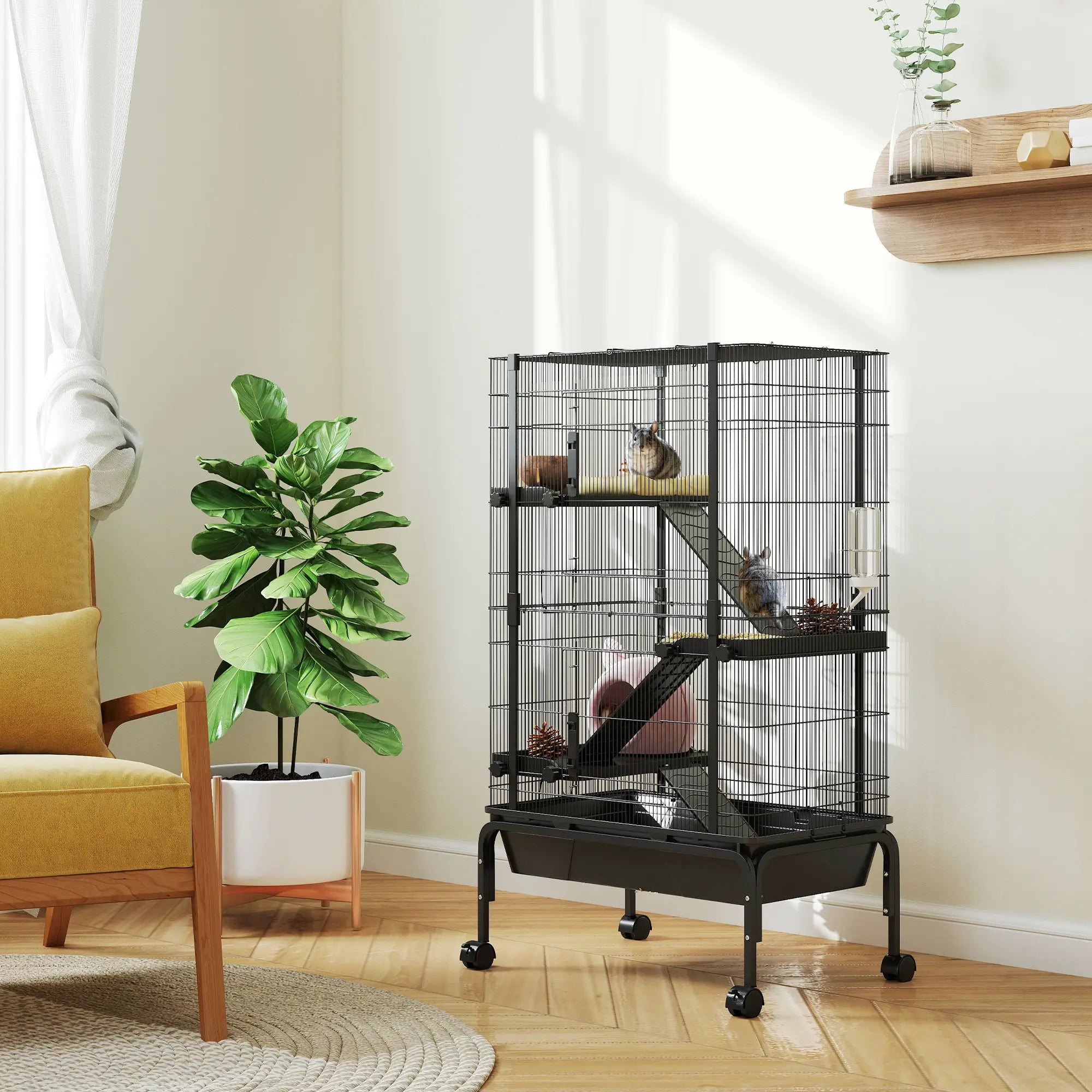 - Four-level cage suitable for chinchillas, rabbits, ferrets, squirrels, and large Syrian hamsters.
