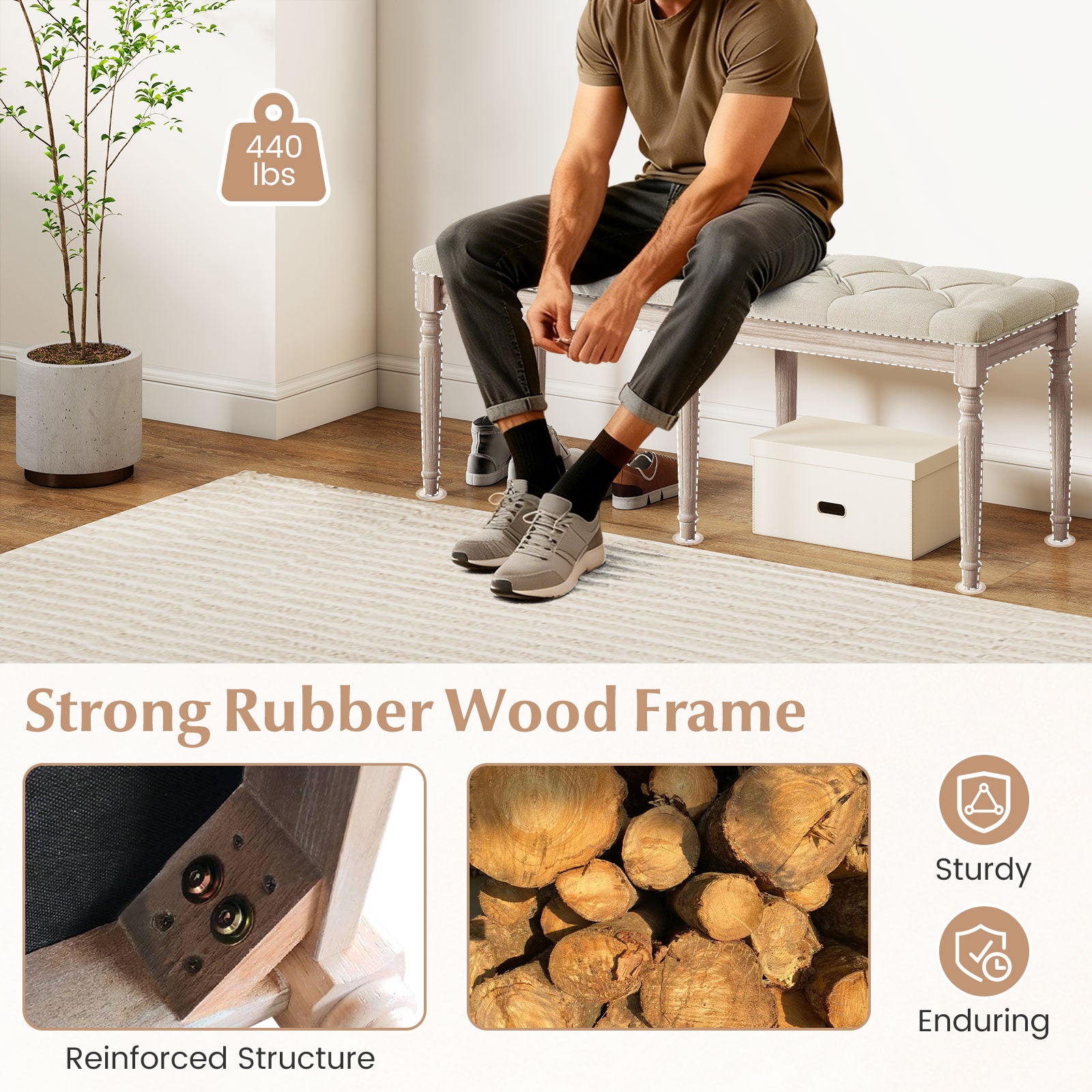 Selected Rubber Wood: Crafted on a high-quality rubber wood frame, this upholstered bench is anti-deformation and crack-resistant, ensuring a long-lasting service life. Its splinter-free surface also shows great craftsmanship.Elegant Retro Style: This end of bed bench features a button-tufted surface on the seat and carved vintage legs that add a touch of sophistication. This elegant style elevates your indoor decorations, making it an appealing piece for any room.