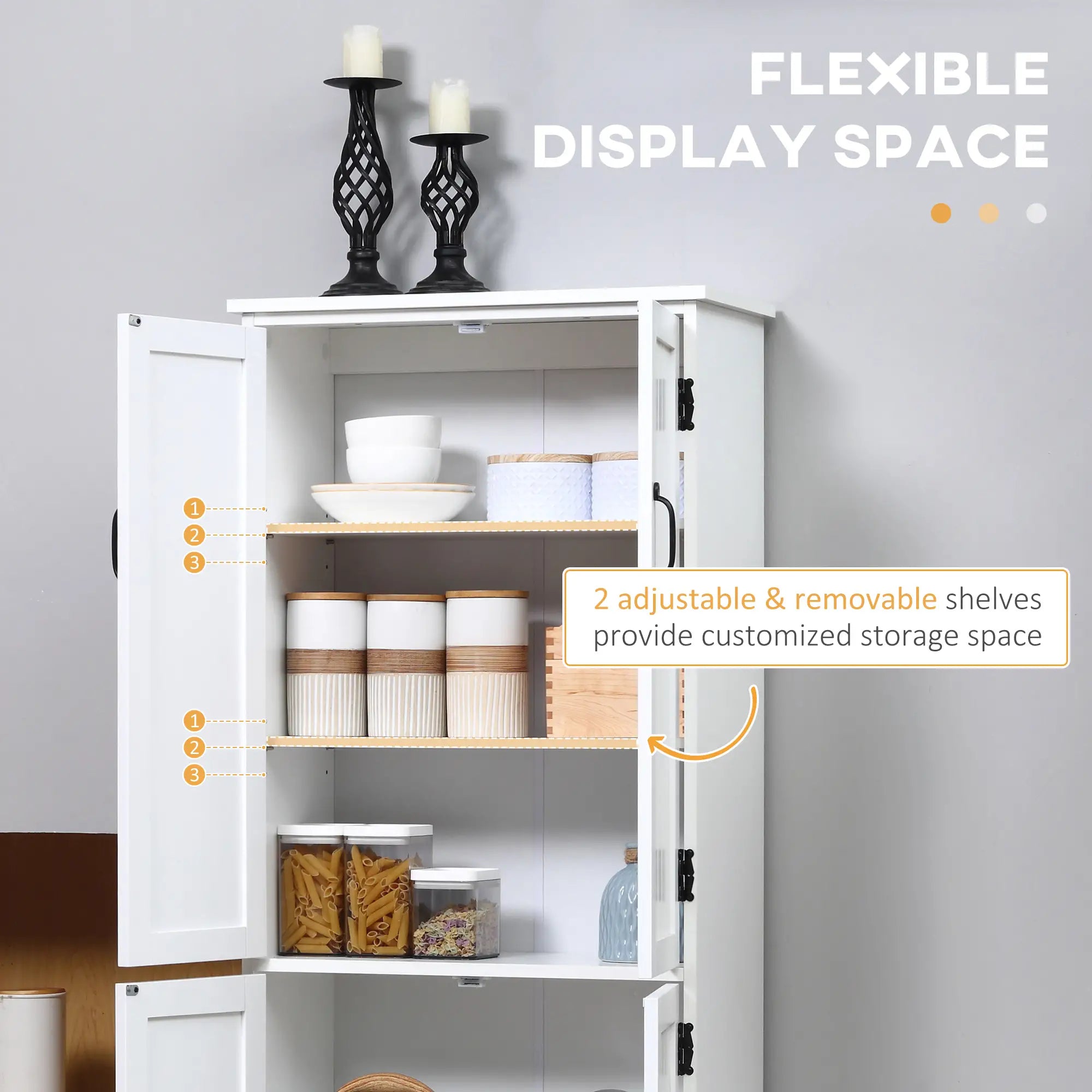 - Adjustable and removable shelves for customizable storage.