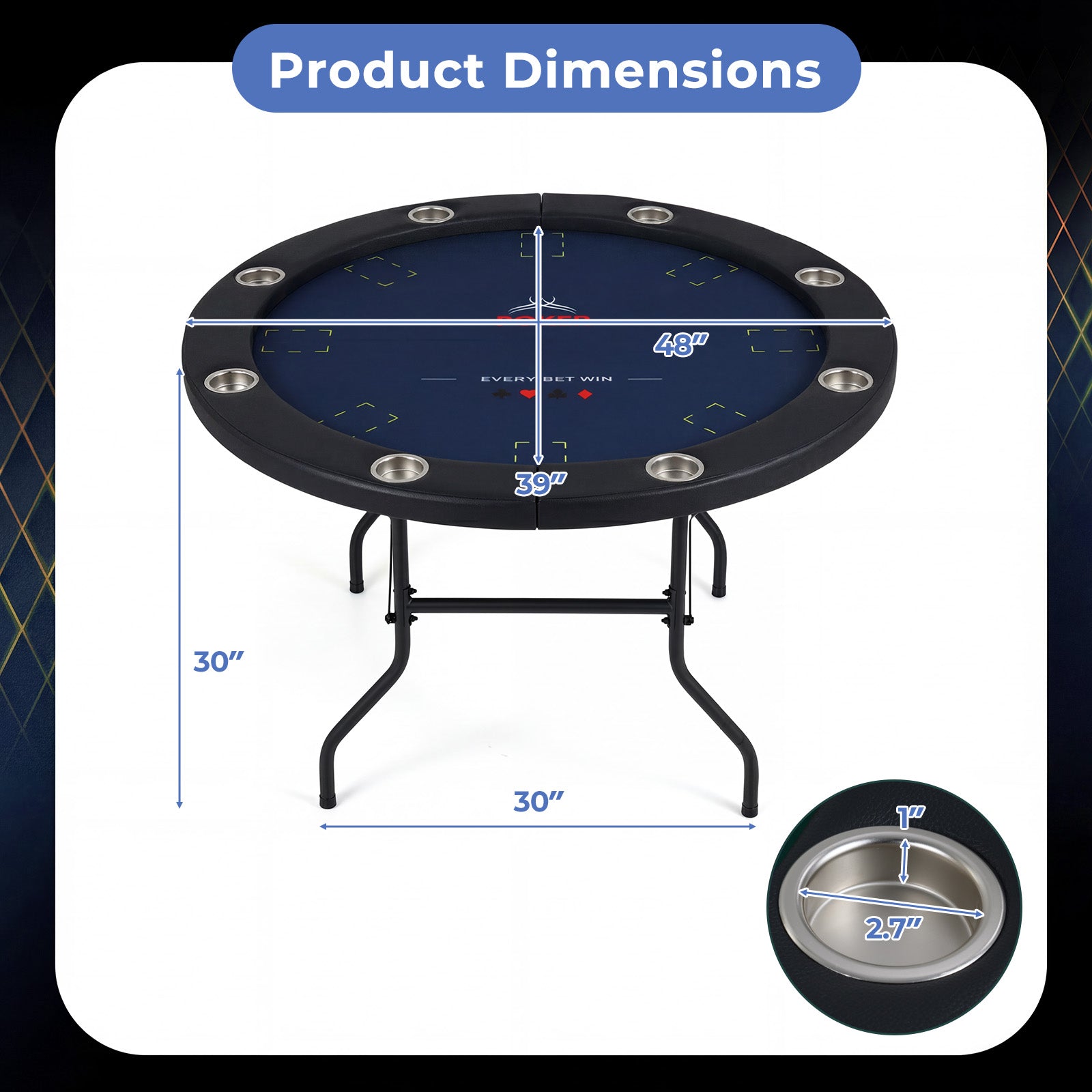 Spacious Poker Table: Featuring a generous 48" x 48" playing tabletop, this poker table provides ample space for each player, ensuring a comfortable gaming experience. Plus, it is designed to comfortably accommodate up to 6-8 players, making it ideal for games like blackjack, Texas Hold'em, or other card games.Foldable & Portable Design: The legs of this blackjack game table feature a quick-folding mechanism for ultimate convenience. It allows the entire table to be stored flat for easy transport or compact storage against a wall or in a car trunk. Note: The tabletop itself cannot be folded after installation.