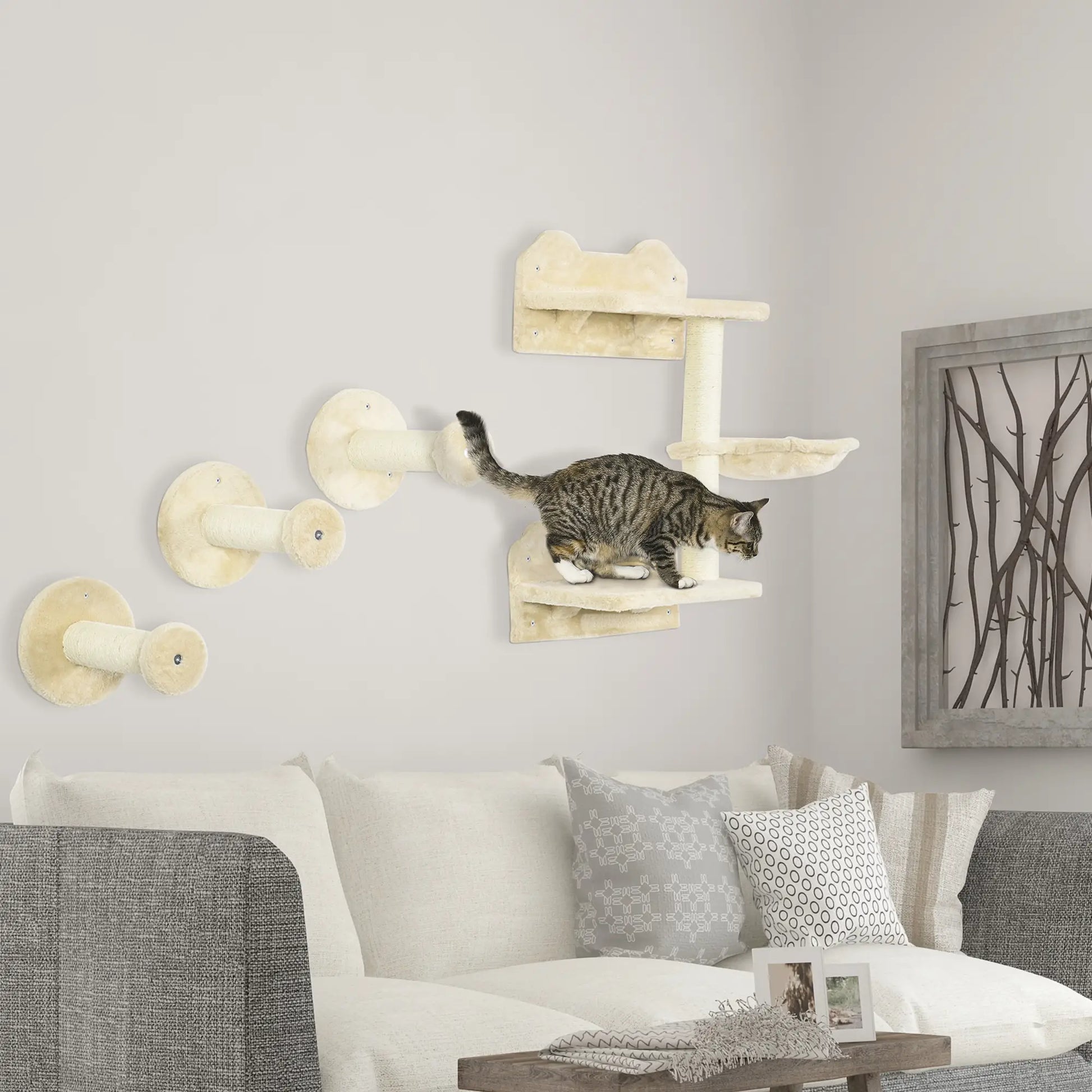 4Pcs Cat Wall Shelf with Scratching Posts, Hammock, Beige