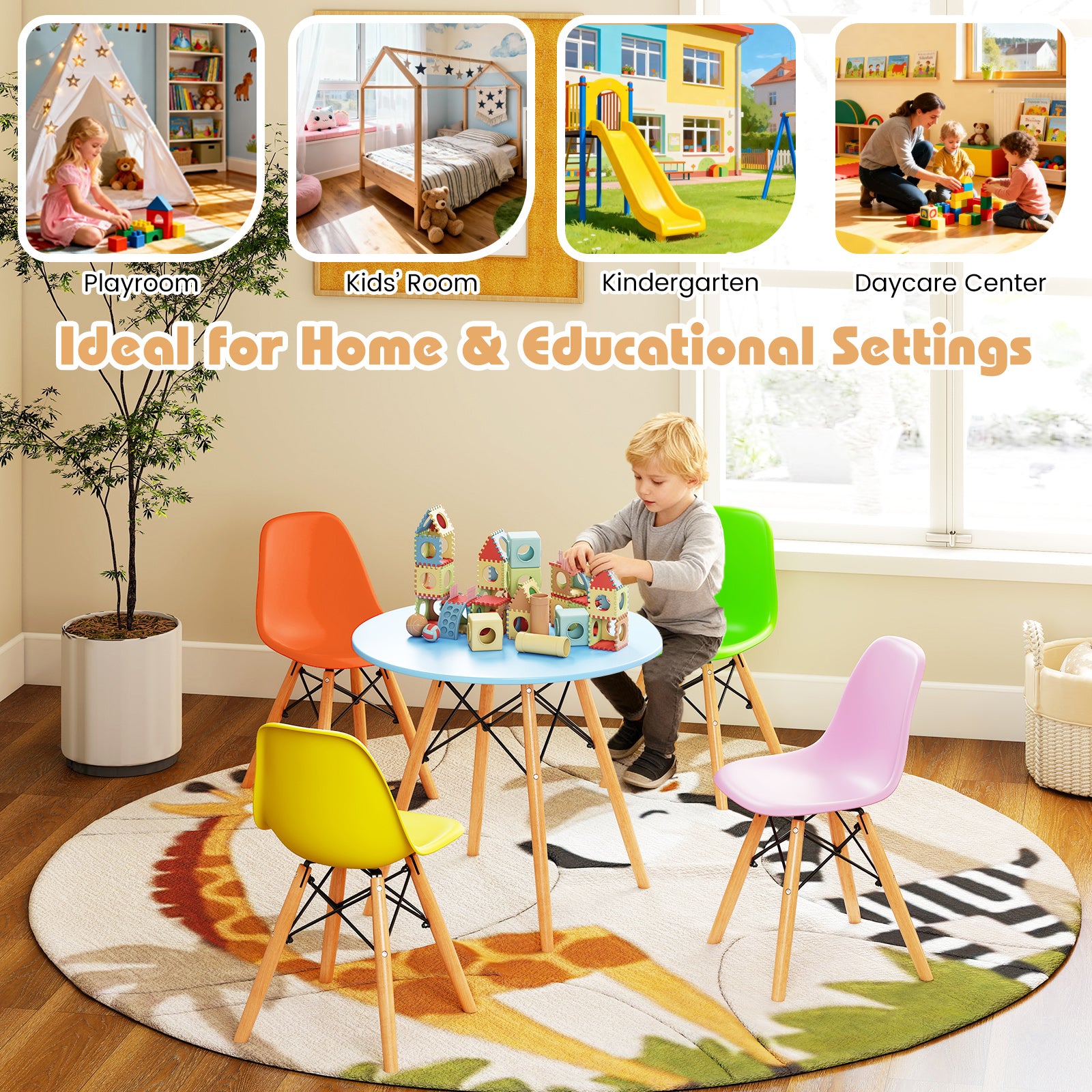 This colorful children's table and chairs set offers a safe, durable, and ergonomic space for kids aged 3-12 to eat, read, write, draw, and play. Featuring a round table and four armless chairs with backrests, it combines sturdy solid wood legs and an iron frame with easy assembly and cleaning for parents.