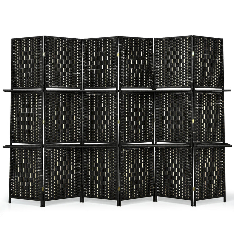 6 Panel Folding Weave Fiber Room Divider with 2 Display Shelves , Black