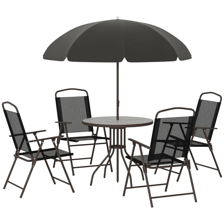 Enhance your outdoor living space with this modern and stylish 6-piece patio dining set, perfect for gardens, patios, or balconies. The set includes a round glass-top table with umbrella hole, 4 foldable and stackable chairs, and a chic patio umbrella for sun protection. Crafted from durable all-weather texilene and steel frame, it's designed for year-round outdoor use.