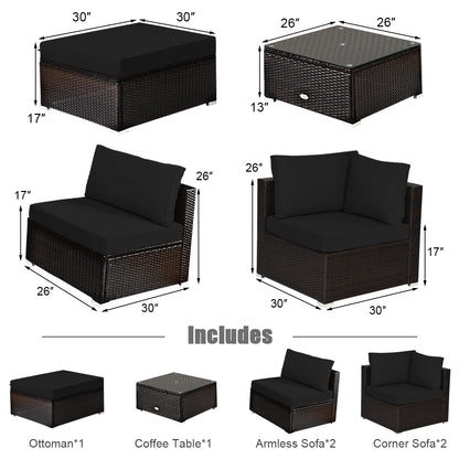 6 Pieces Outdoor Patio Rattan Furniture Set Sofa Ottoman-Dark Black, Black