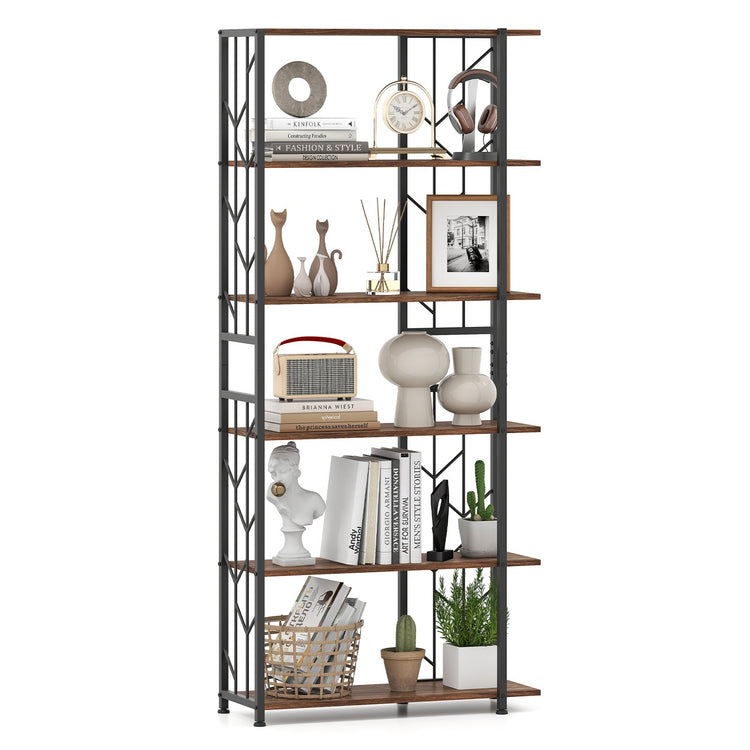 6-Tier Bookshelf Modern Geometric Bookcase with Heavy-duty Metal Frame and Anti-tipping Kits, Rustic Brown