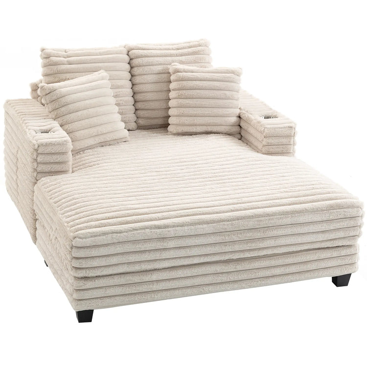 60" Chaise Lounge Chair, Upholstered Sofa Bed With Cup Holders, Beige