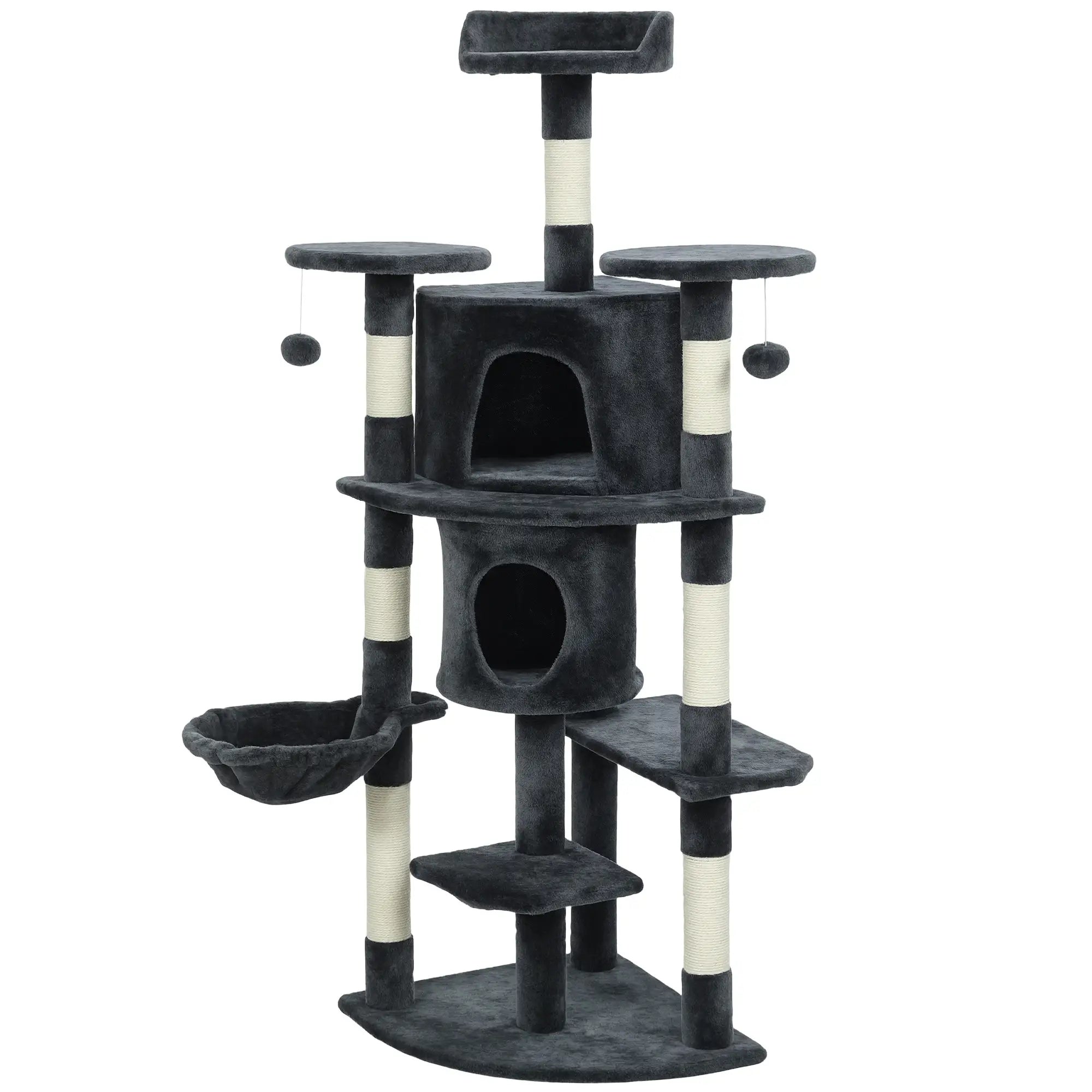 62" Cat Tree, Scratching Post, 2 Condos, Hammock, Perches, Dark Grey