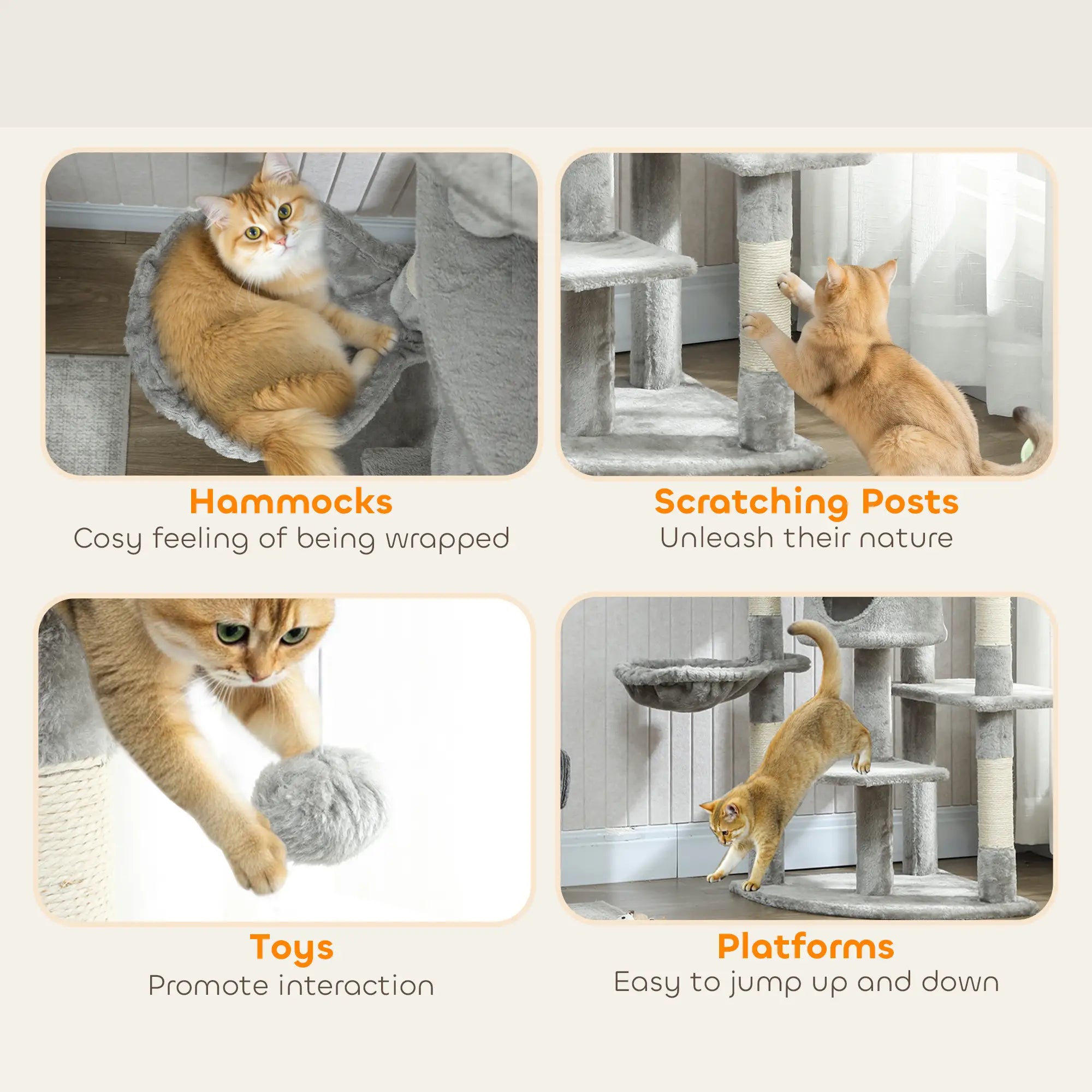 - Multi-level cat tree with condos, hammock, and perches for comprehensive play and rest