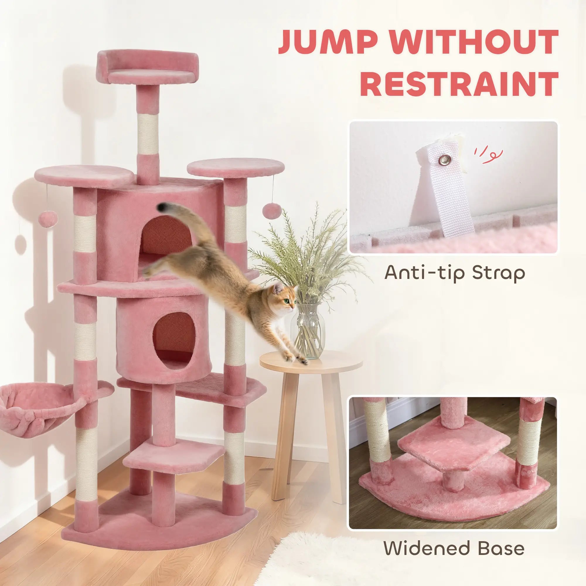 62" Cat Tree With Scratching Post, 2 Condos, Hammock, Pink
