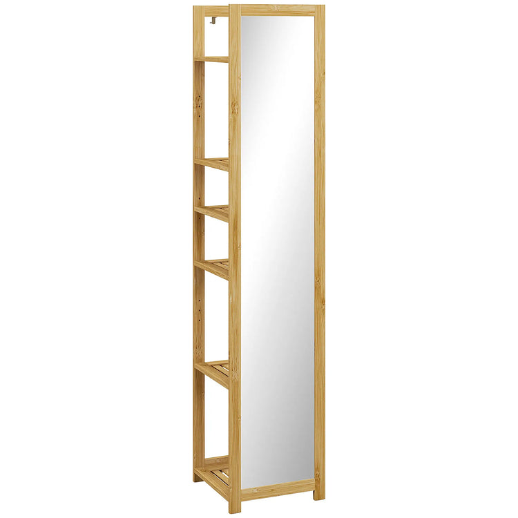Transform your space with this elegant bamboo floor mirror featuring a six-tier shelf, perfect for organizing essentials while offering a full-length reflection. Ideal for bathrooms, this piece combines functionality with natural aesthetics.
