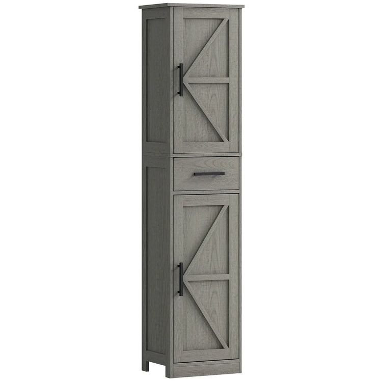 Elevate your bathroom's organization and style with our farmhouse-inspired tall and narrow storage cabinet. Featuring charming barn doors with T-bar handles, this cabinet offers a rustic yet functional solution for your space. With a top two-tier cabinet, a bottom three-tier cabinet, and a middle drawer, each equipped with adjustable shelves, it's designed to maximize storage efficiently.