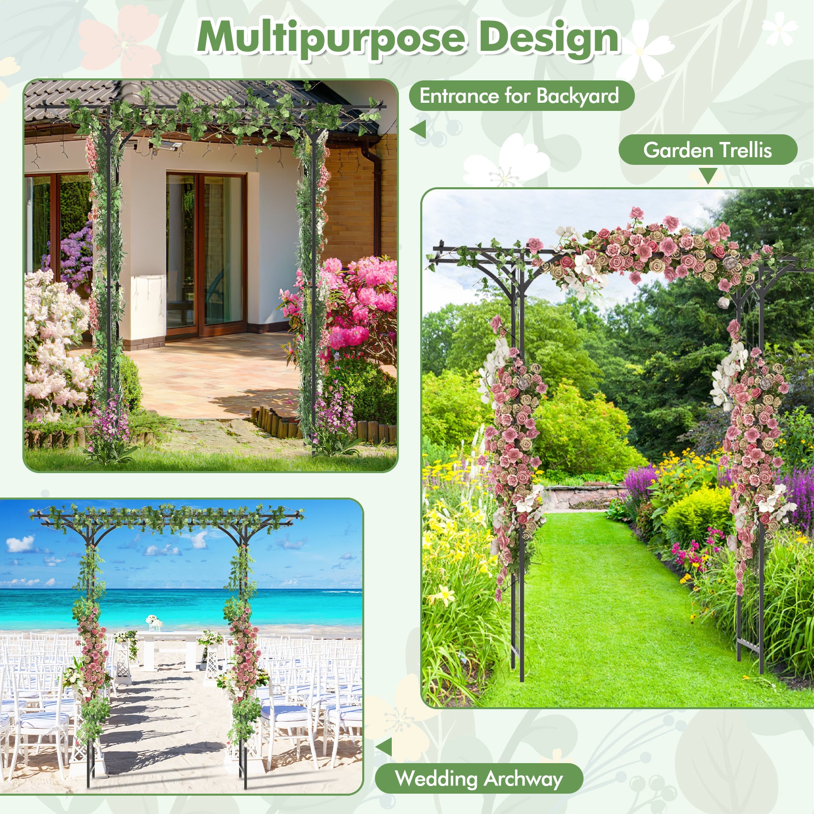 Versatile Application: Whether used as an entrance to your garden or yard, a garden climbing pergola for plants, a beautiful wedding arch, or an event photo backdrop stand, this metal garden arbor adapts to various settings and functions with ease.