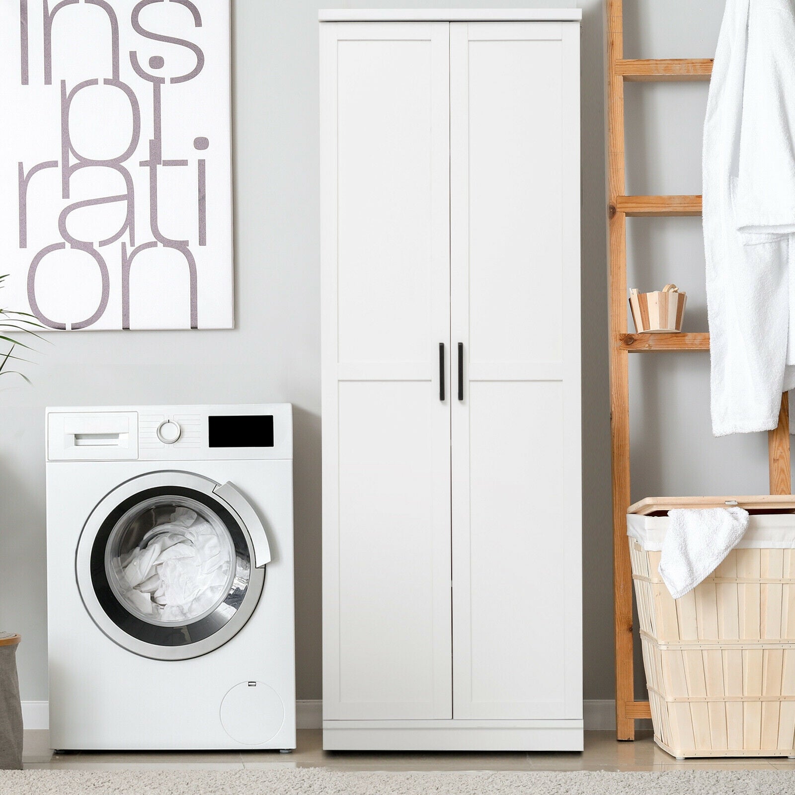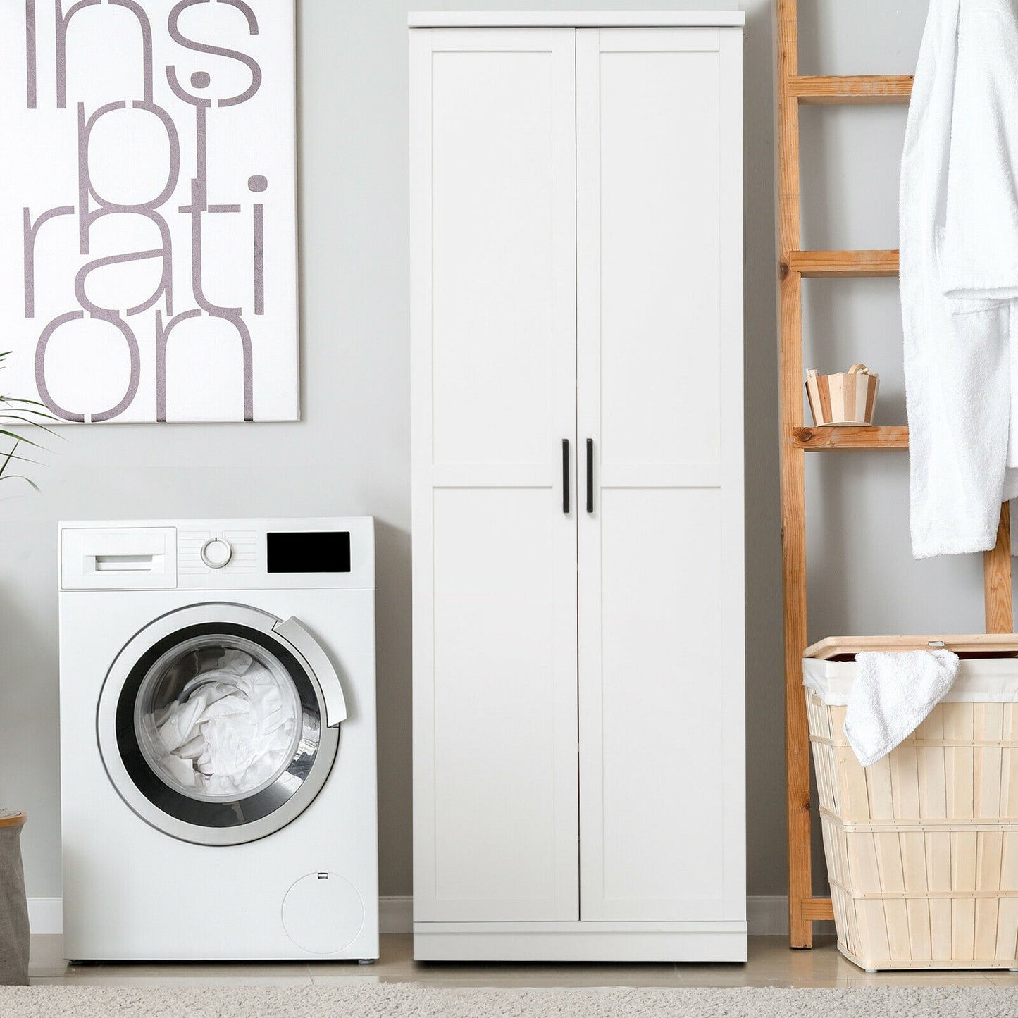 Multifunctional Storage Cabinet: With its simple white finish and modern elegant appearance, this storage cabinet can blend well into the furnishing styles and add extra storage space to any room. It can be used as a kitchen cupboard, a bedroom wardrobe, a garage utility cabinet, or a laundry storage organizer.