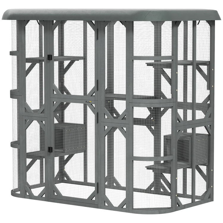 71" Wooden Cat Enclosure, With Platforms And Condos, Grey