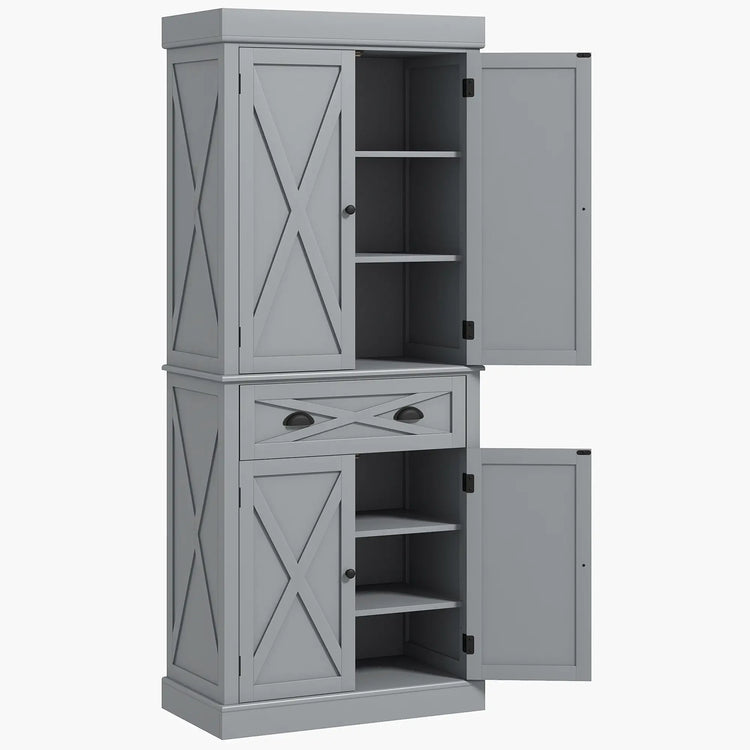 72.5" Kitchen Pantry Cabinet, 4 Doors, Drawer, Adjustable Shelves, Grey
