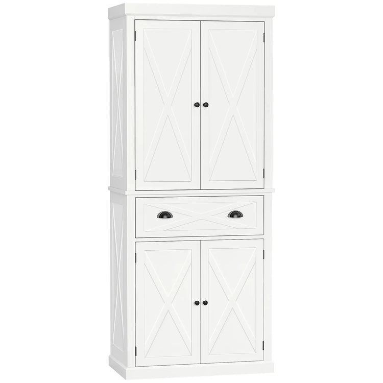 72.5" Kitchen Pantry Cabinet, 4 Doors, Drawer, Adjustable Shelves, White