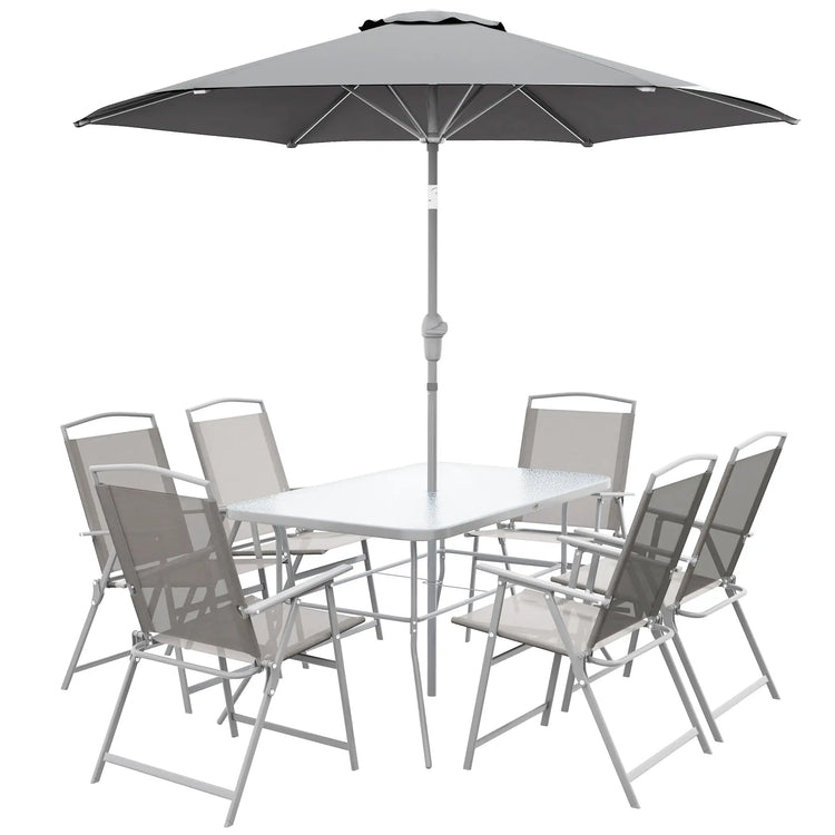- Complete set includes a rectangular table, sunshade umbrella, and six chairs