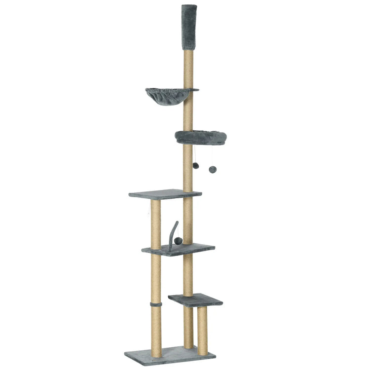 90.5" - 98.5" Cat Tree Tower, Scratching Post, Platforms, Bed, Hammock, Grey