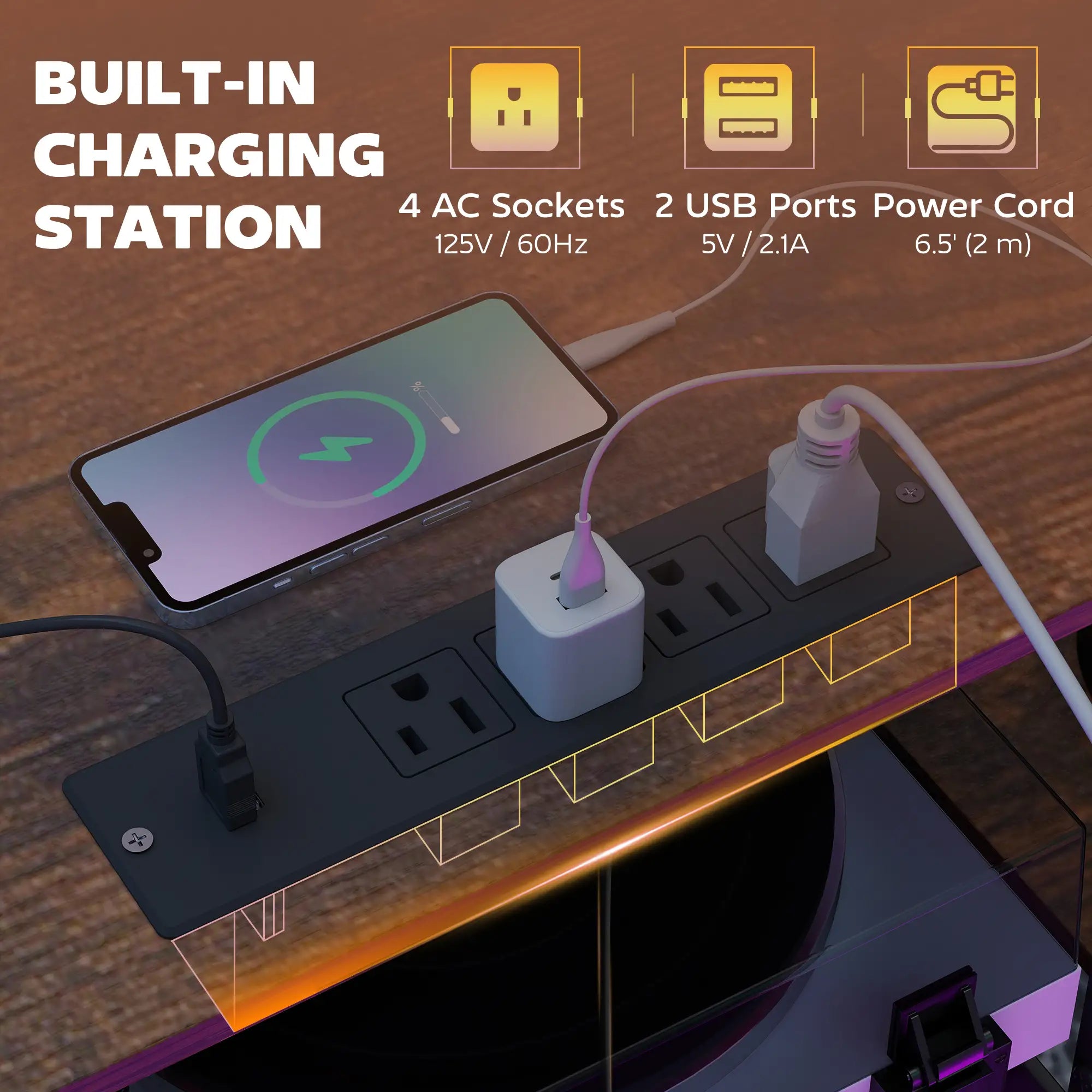 - Built-in power strip with outlets and USB ports eliminates cable clutter and keeps devices charged