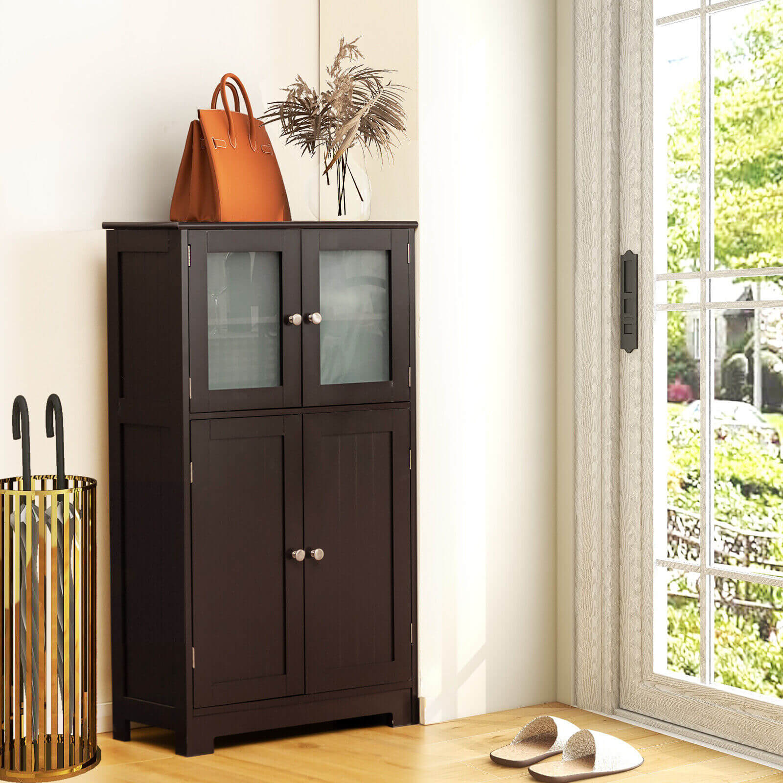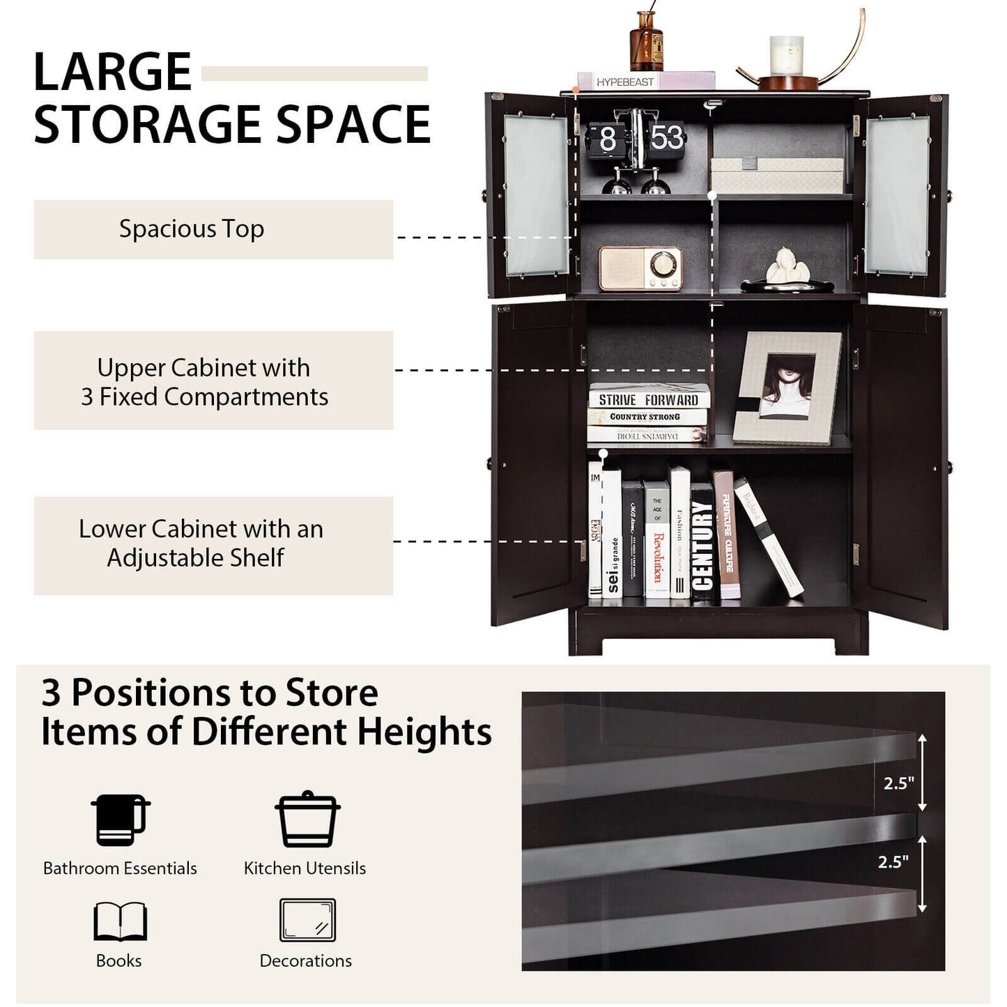 5 Storage Compartments and Adjustable Shelf: Equipped with a spacious top, an upper cabinet with 3 fixed compartments, and a lower cabinet with a 3-position adjustable shelf, this 4-door floor storage organizer can keep all your items well organized, such as bathroom essentials, kitchen utensils, books, decorations and more.