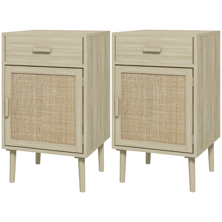 Boho Bedside Tables Set of 2, Nightstands with Drawer, Rattan Cabinet, Oak